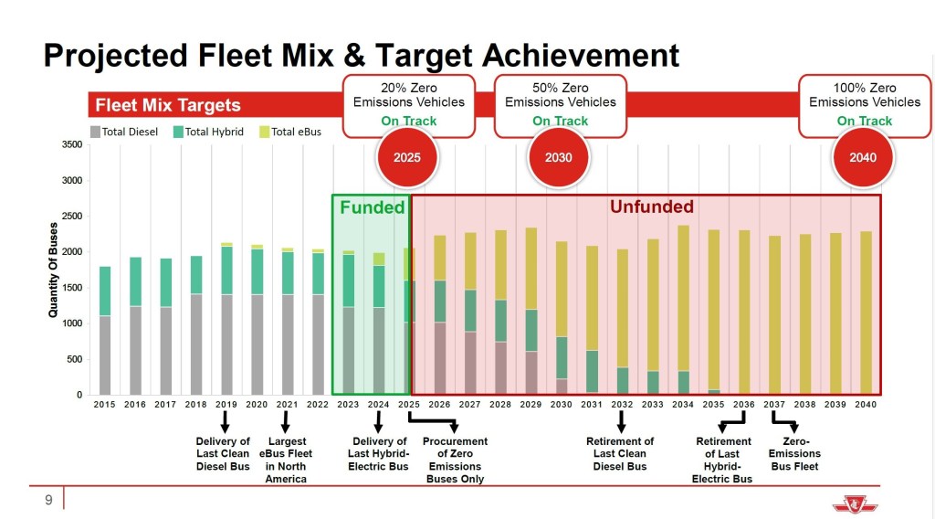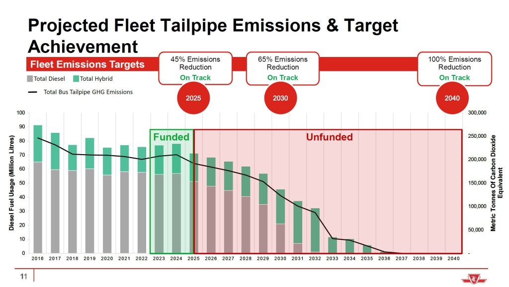 The City of Toronto has a goal to move to a zero-emission fleet across all departments by 2040 with interim goals of 20% in 2025 and 50% in 2030. TTC’s electrification plans fit within that timeframe.