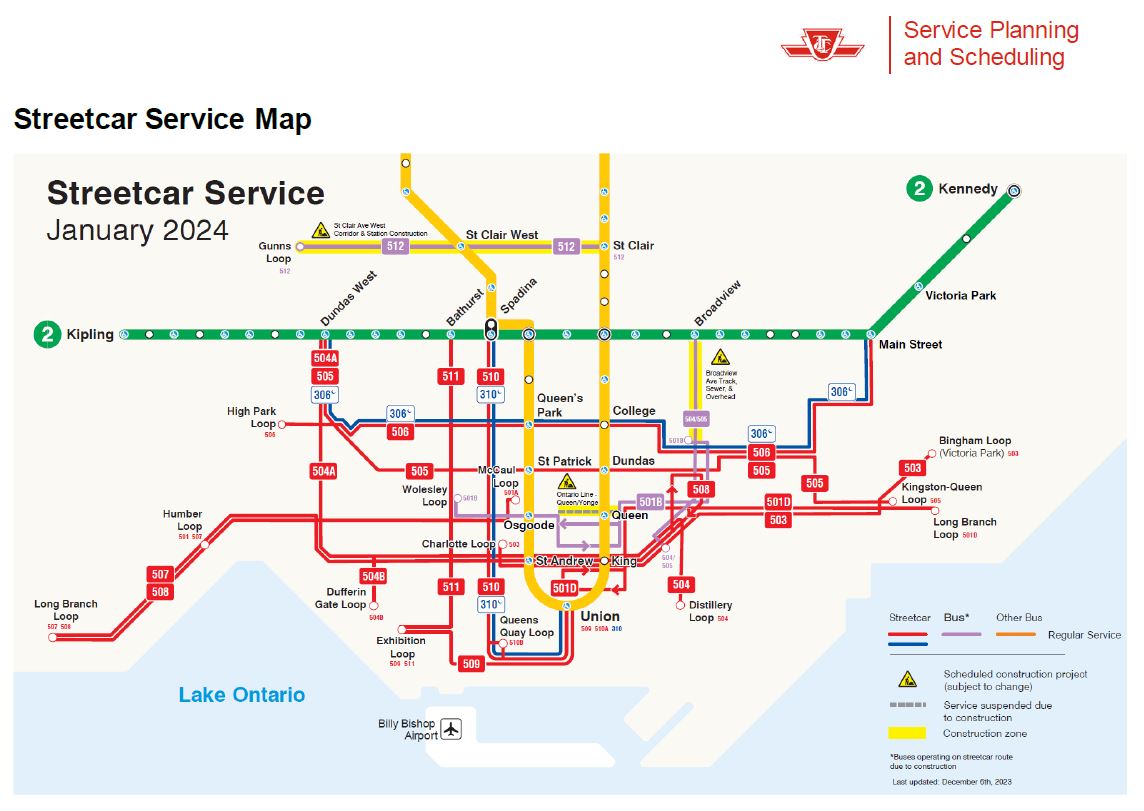 Note that this route will change again in mid-February thanks to completion of work at Broadview Station, as well as planned water main and track work on King West from Shaw to Dufferin.