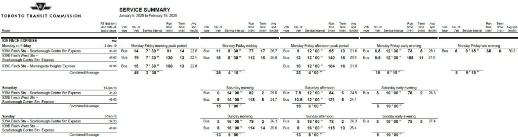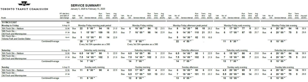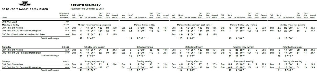 For example, the tables below show the scheduled service levels for the 39 Finch East and 939 Finch Express routes in January 2020 and November 2023 (these schedules will remain in effect in January 2024). Worth noting: