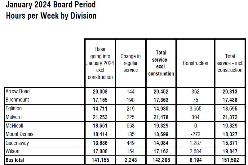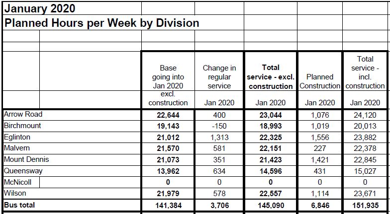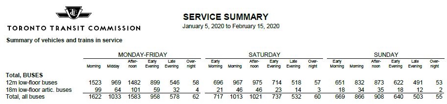“Service” also includes crowding standards. It is hardly valid to claim full service restoration if crowding standards pack more riders per vehicle before service is improved, and even that depends on available vehicle hours in the budget. It has been many years since the TTC published current loading stats and a list of routes that are operating beyond standards.