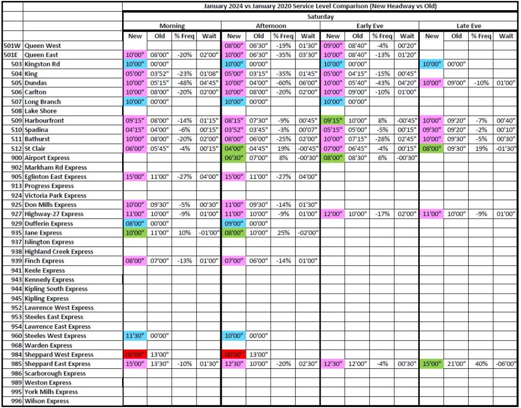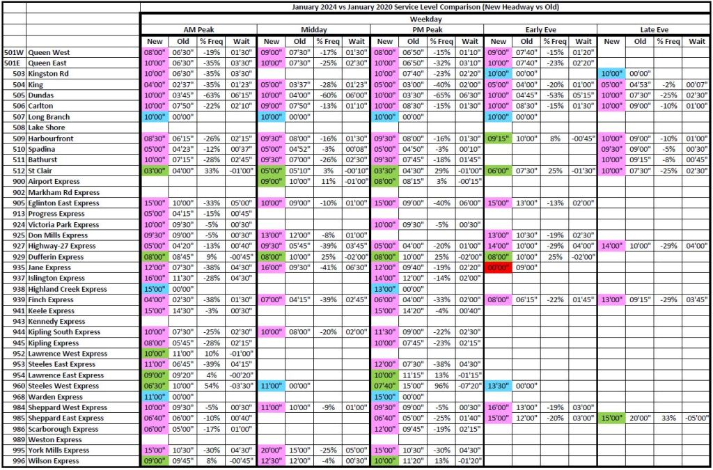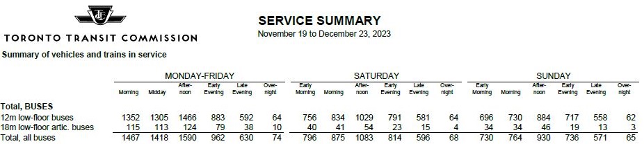 Another way to compare overall service levels is the number of buses in service by period. Here are the January 2020 and November 2023 totals (the January 2024 information has not yet been published in this format). Note that these numbers include service added to routes to deal with construction delays, but not the “run as directed” buses which the TTC routinely hypes with claims that service is actually better than on the schedules even though there are far too few “RADs” to make much of a difference.