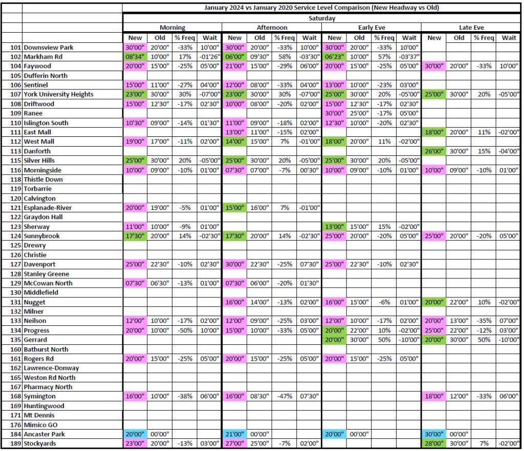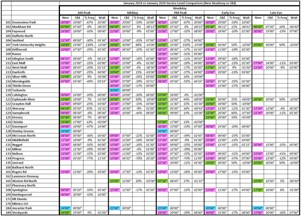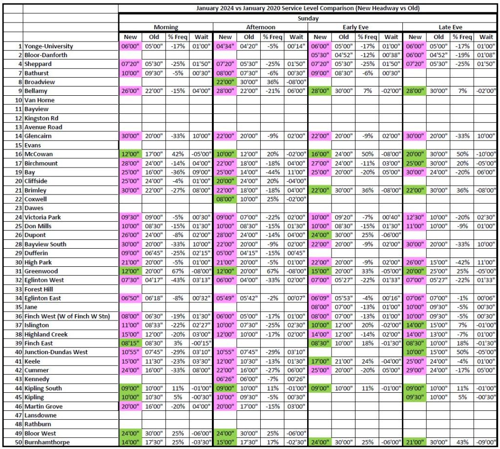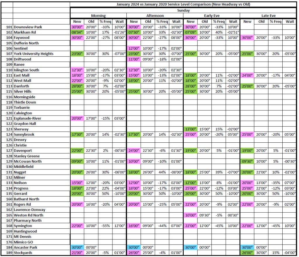 3. I’ll bet most of the service increases are because of the Line 3 disappearance in Scarborough. This results in an “average” 95%, balanced to the negative with decreases outside of the Line 3 influence.