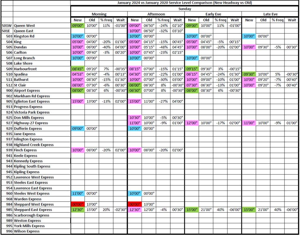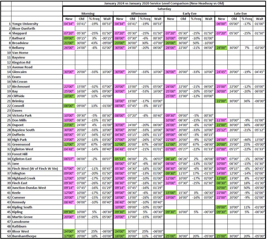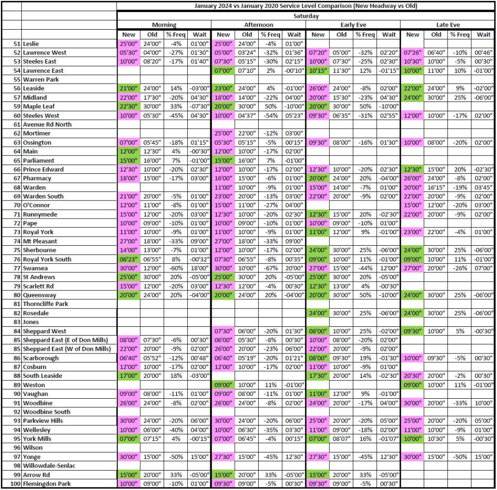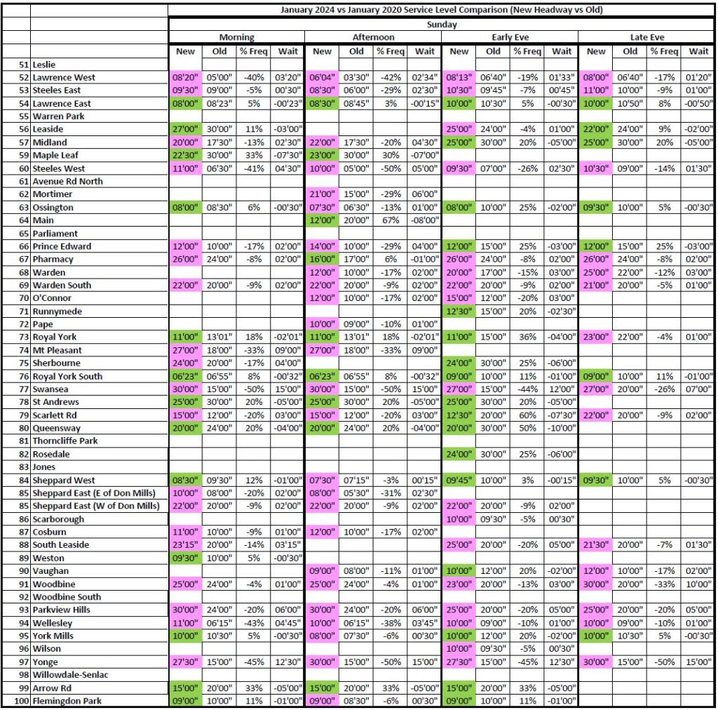 3. I’ll bet most of the service increases are because of the Line 3 disappearance in Scarborough. This results in an “average” 95%, balanced to the negative with decreases outside of the Line 3 influence.