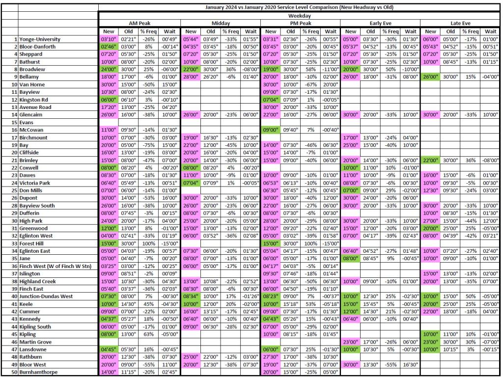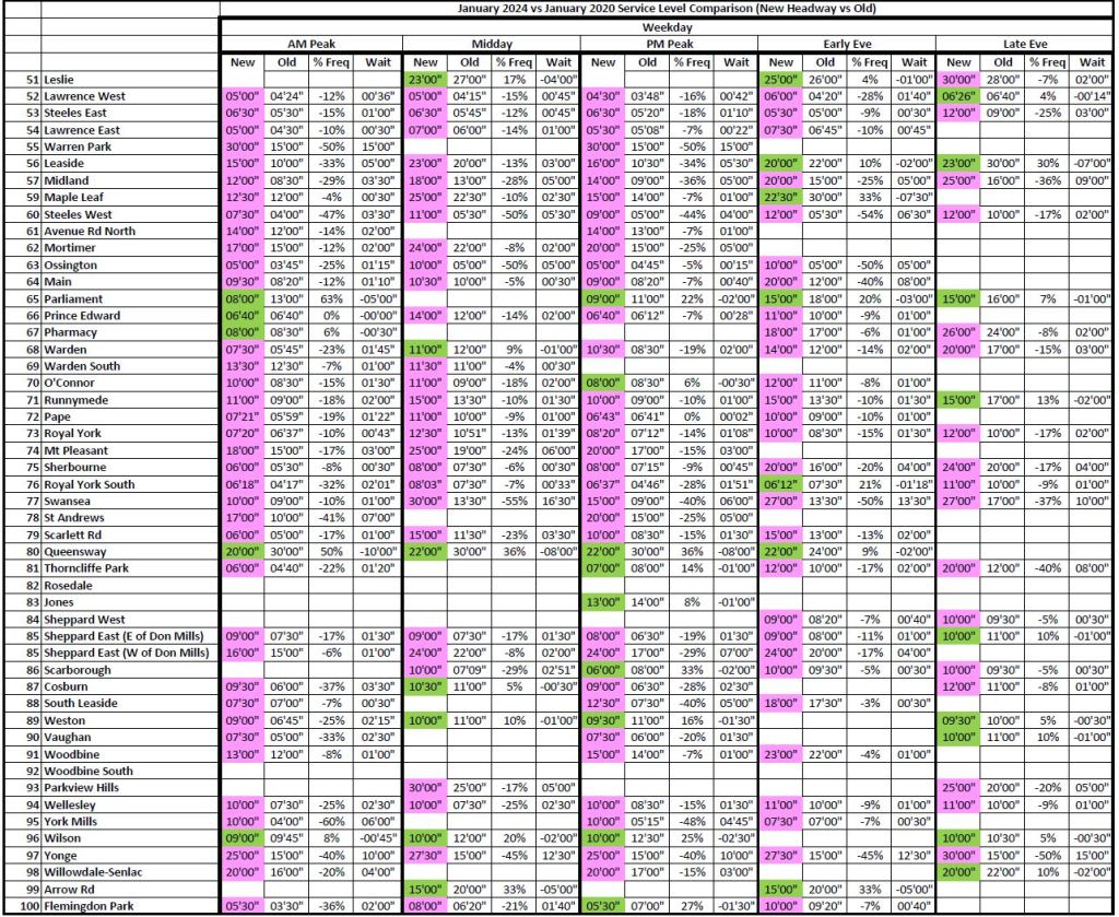 1. As I noted in a different thread the service on line 1 north of Glencairn in morning rush is actually better now than it was pre-Covid despite overall service on the line being worse. So combined table for routes where multiple branches exist now or existed before Covid may not show the full picture.