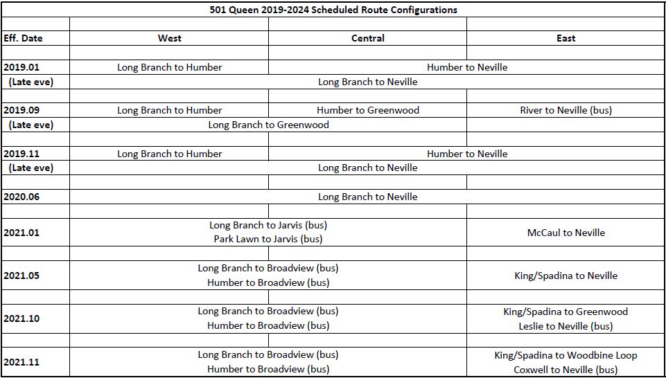 In 2019, the Long Branch service operated as 501L Queen which was equivalent to the current 507 route between Humber and Long Branch Loops. The scheduled speed is slower today with new streetcars than it was in 2019 with the CLRVs.