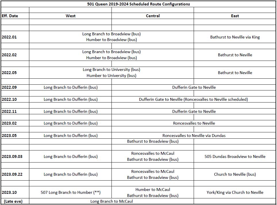 Finding comparative configurations runs into problems that the route operated with buses due to a streetcar shortage, and I have used January 2018 for the “before” data. The Broadview construction began in May 2023, and so the “after” data shown here is from the March 2023 schedules.