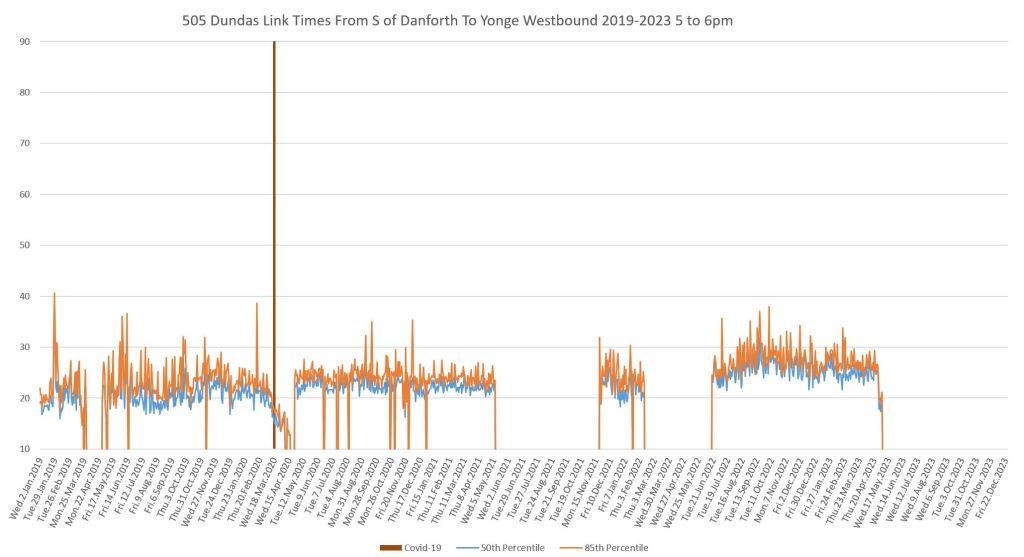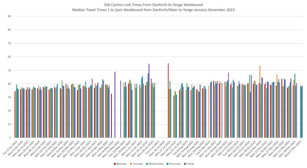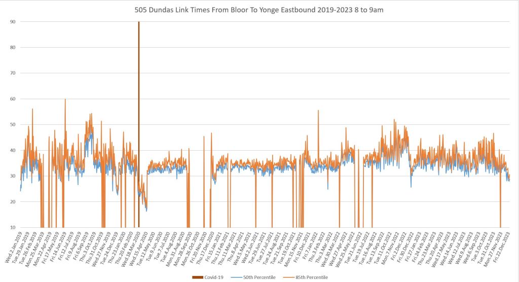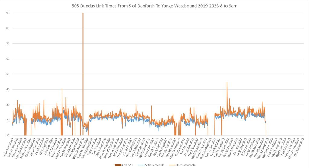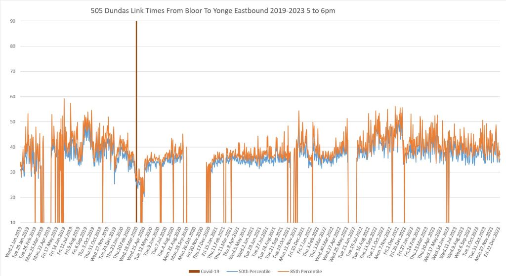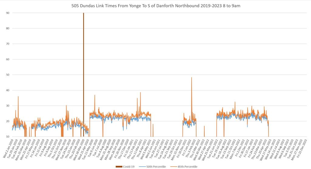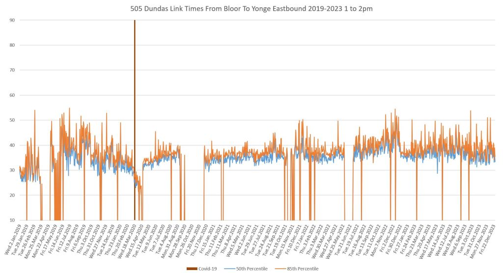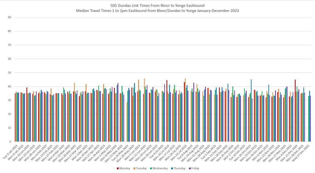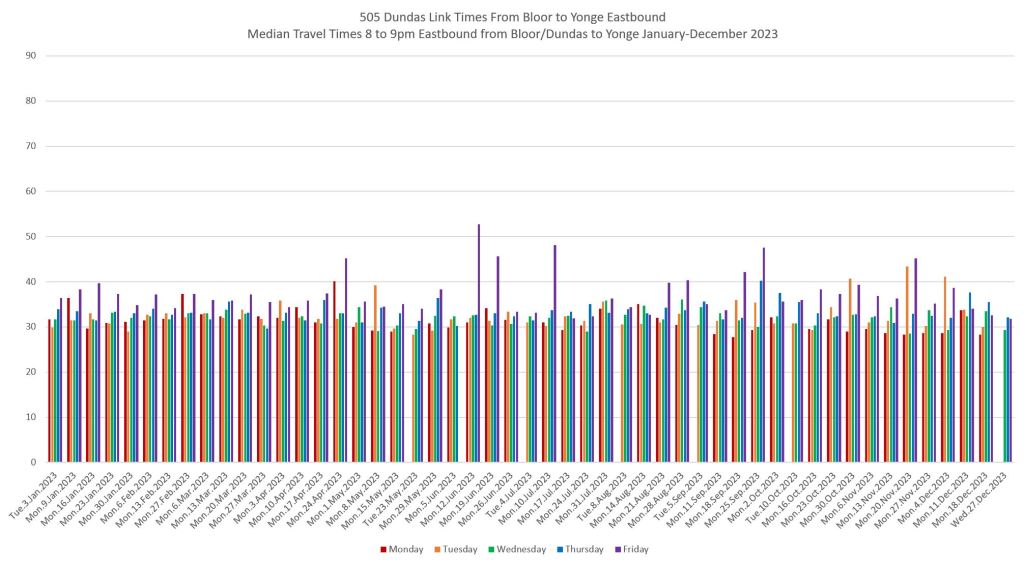 The eastern segment of 505 Dundas has not operated to Broadview Station during various construction projects including for much of 2023. I have not included hour-by-hour charts because, as one can see below, the travel times do not vary much in 2023.