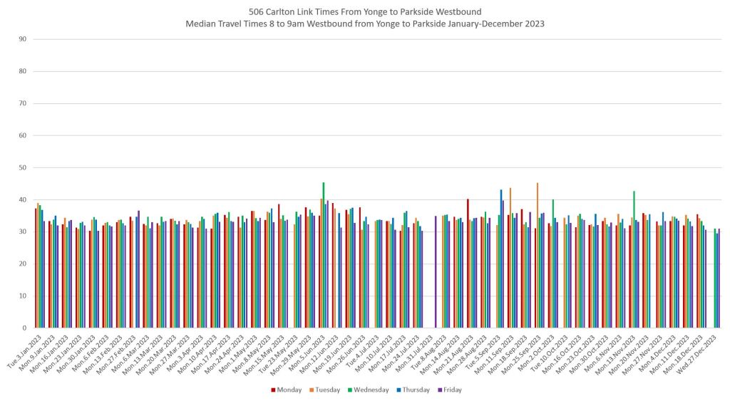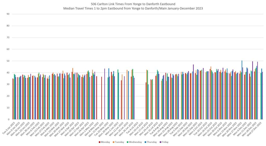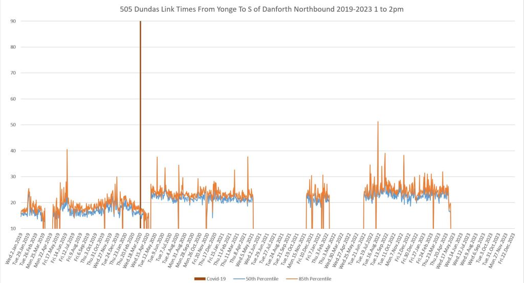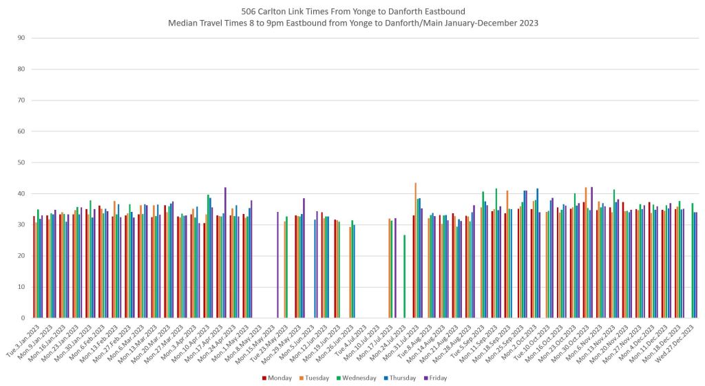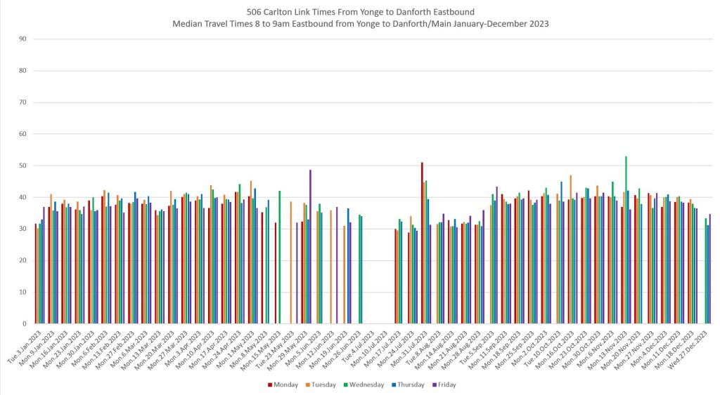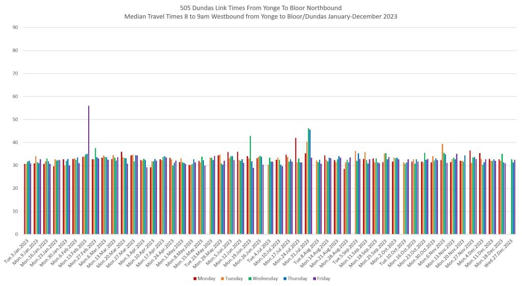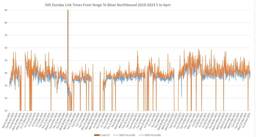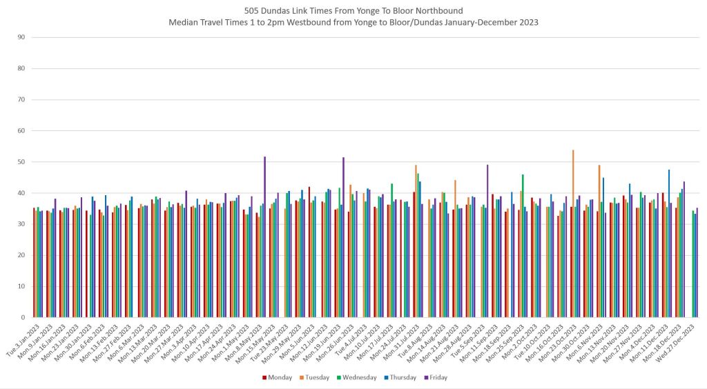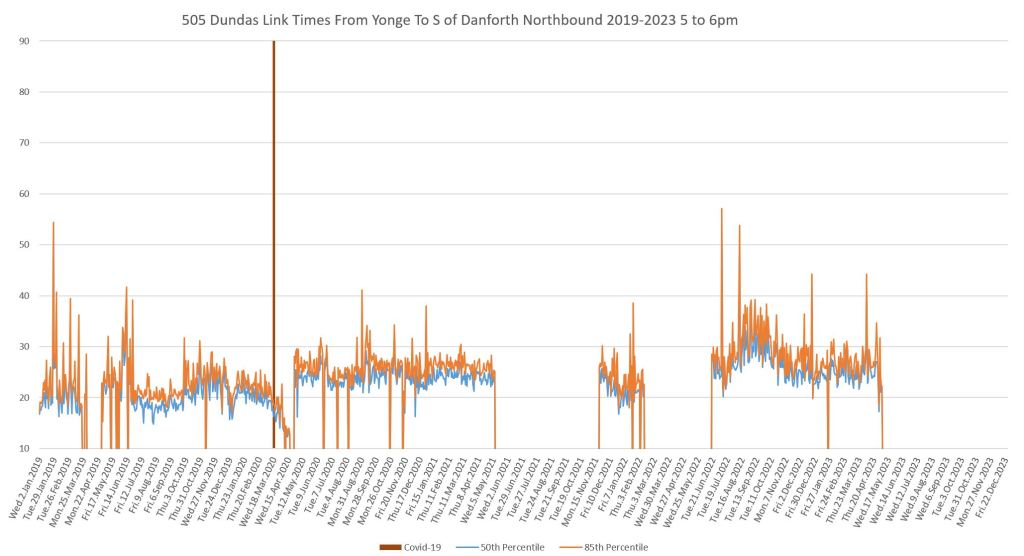 The eastern segment of 505 Dundas has not operated to Broadview Station during various construction projects including for much of 2023. I have not included hour-by-hour charts because, as one can see below, the travel times do not vary much in 2023.