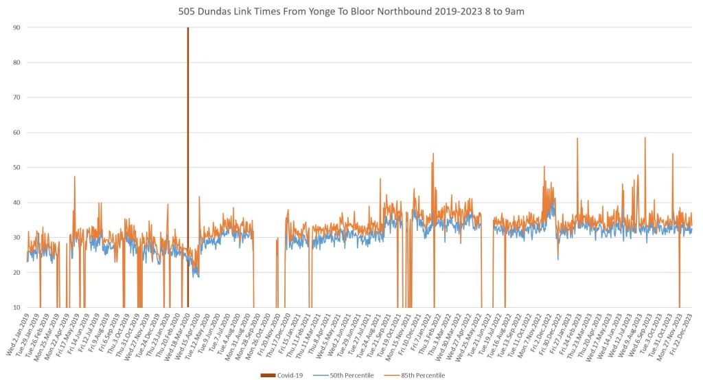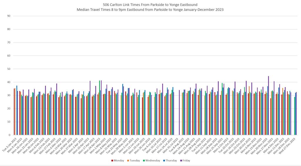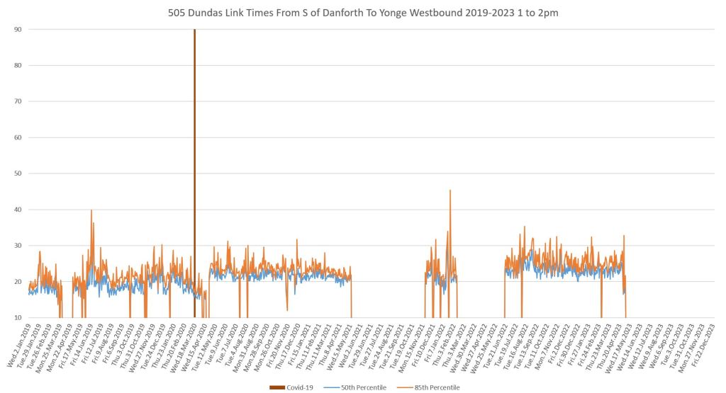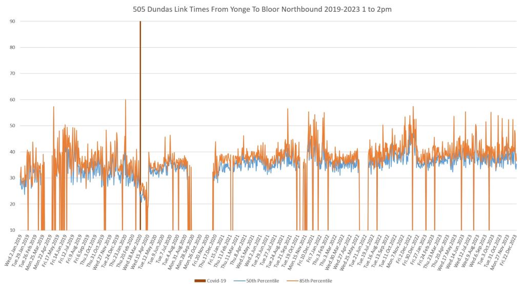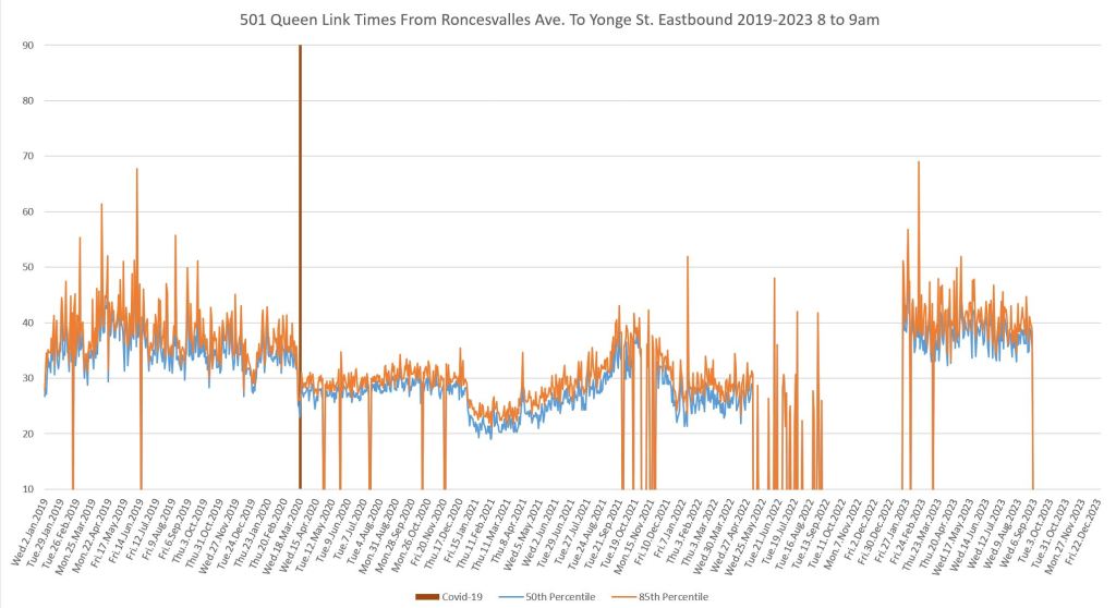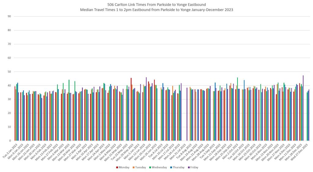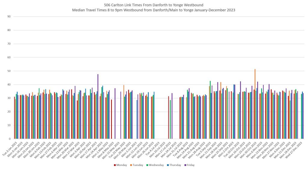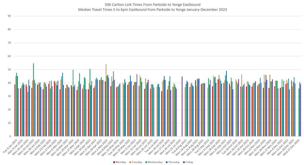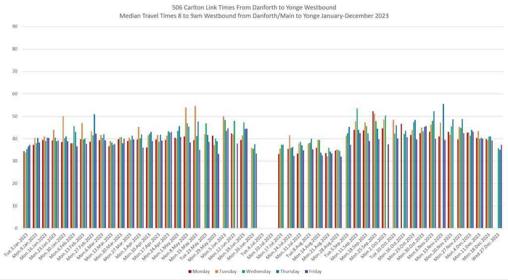 The eastern segment of 505 Dundas has not operated to Broadview Station during various construction projects including for much of 2023. I have not included hour-by-hour charts because, as one can see below, the travel times do not vary much in 2023.