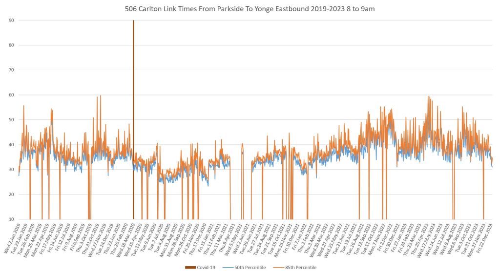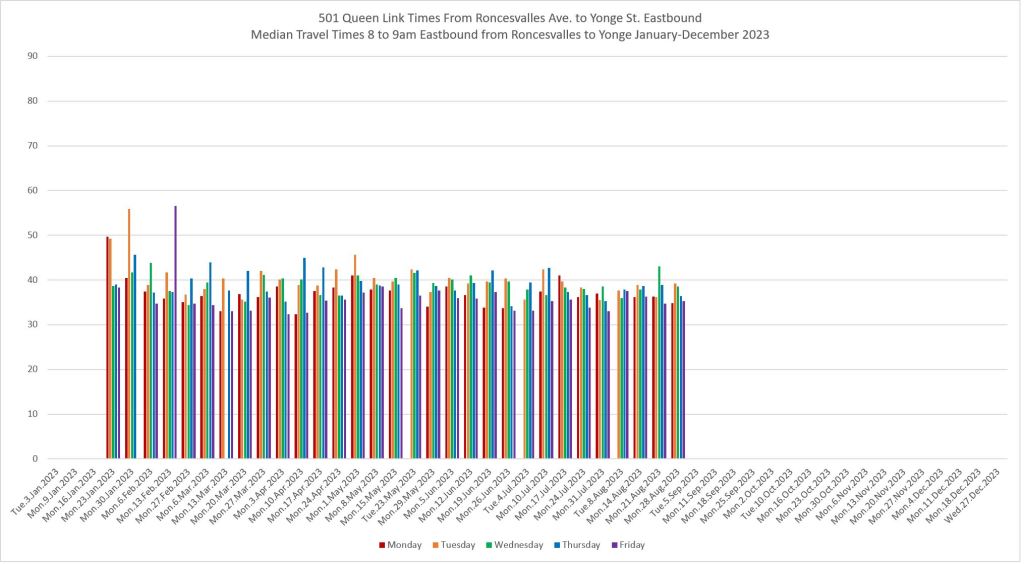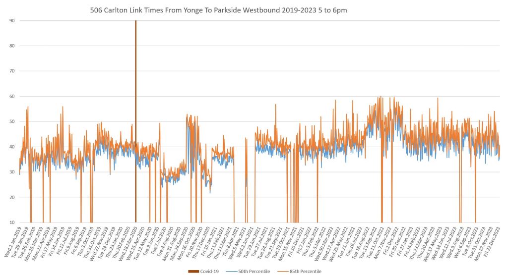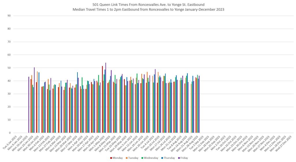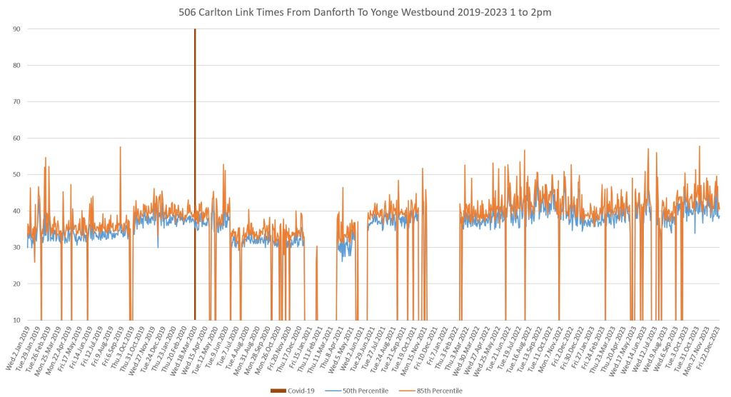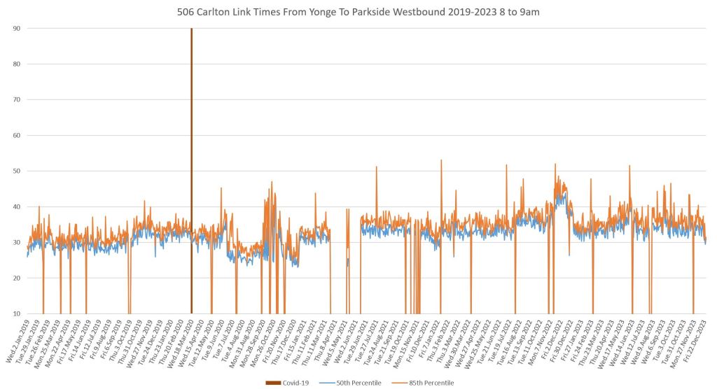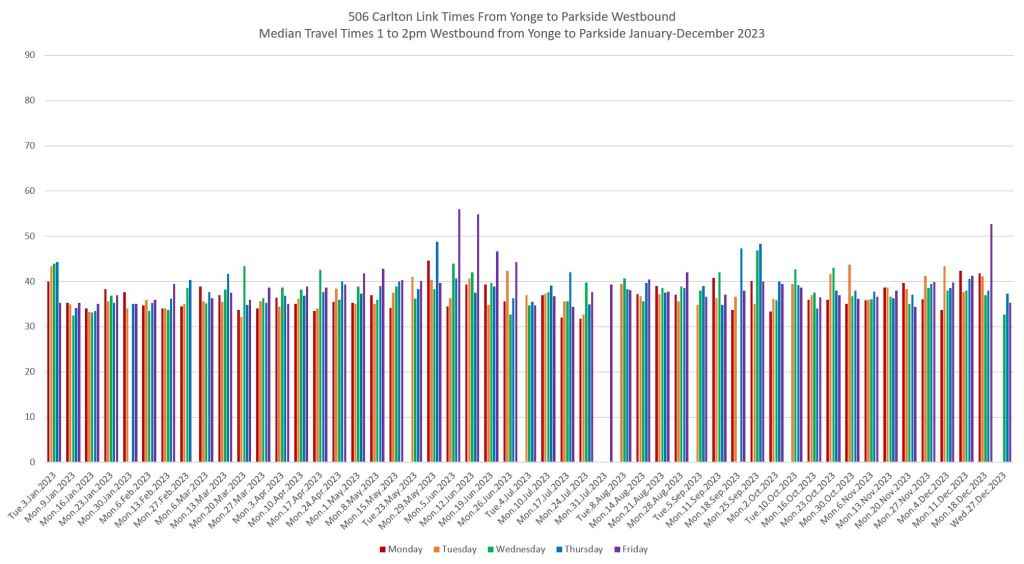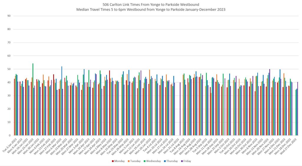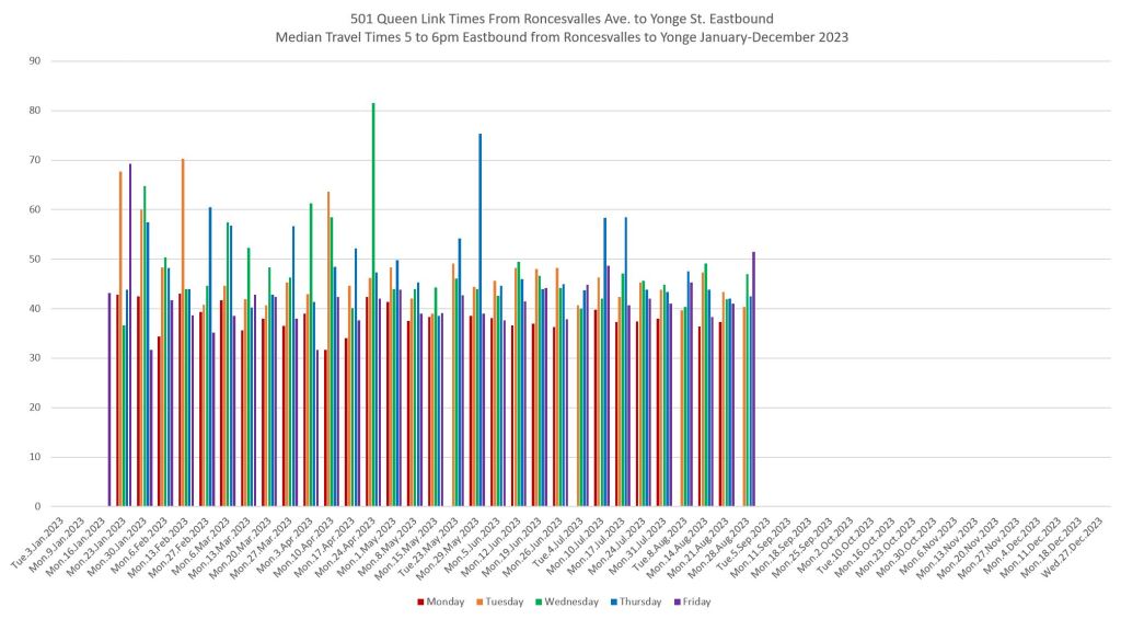 The eastern segment of 505 Dundas has not operated to Broadview Station during various construction projects including for much of 2023. I have not included hour-by-hour charts because, as one can see below, the travel times do not vary much in 2023.