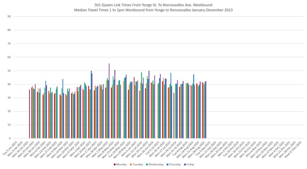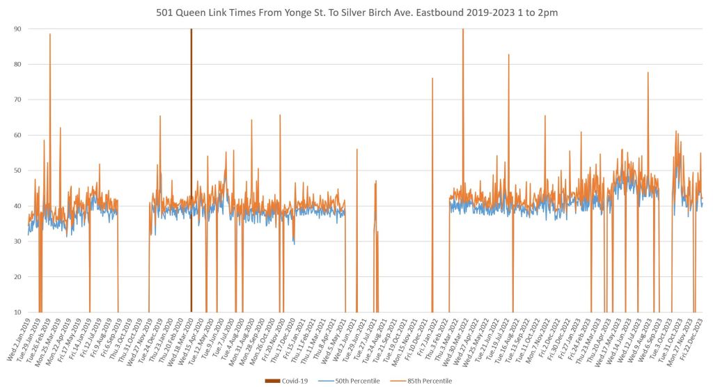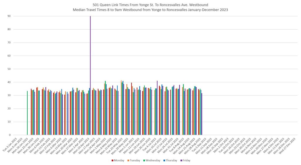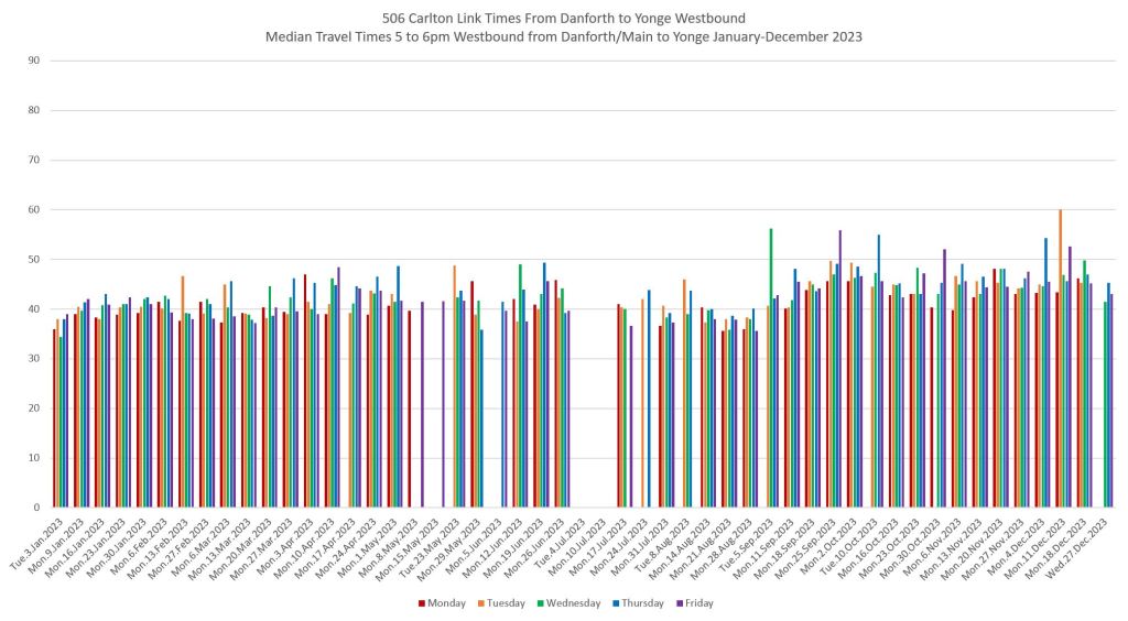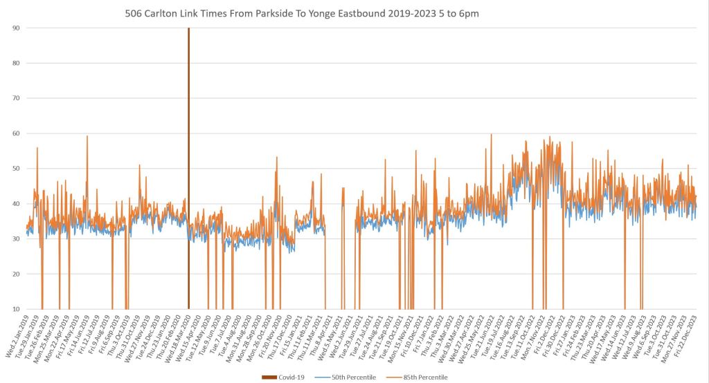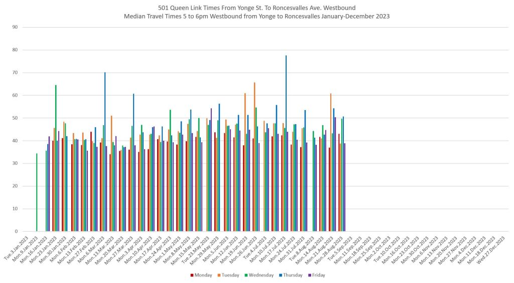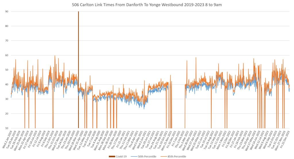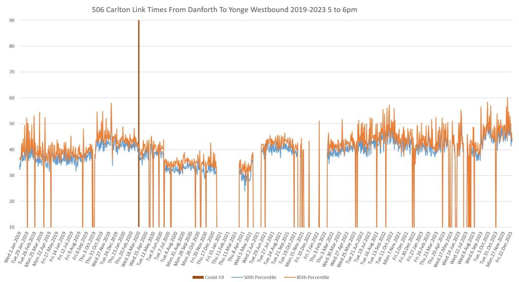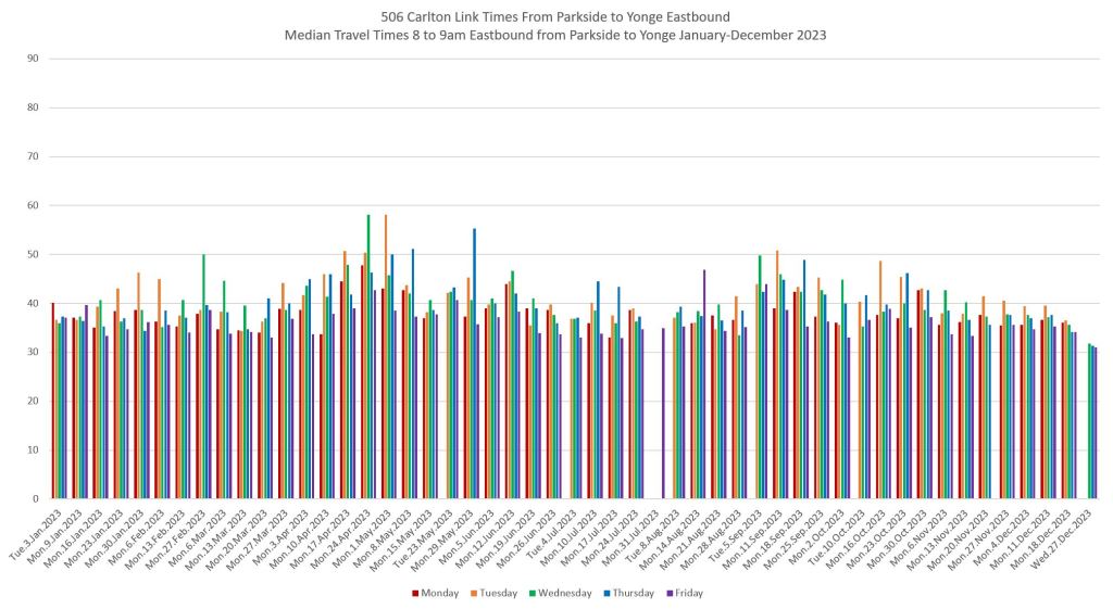 The eastern segment of 505 Dundas has not operated to Broadview Station during various construction projects including for much of 2023. I have not included hour-by-hour charts because, as one can see below, the travel times do not vary much in 2023.