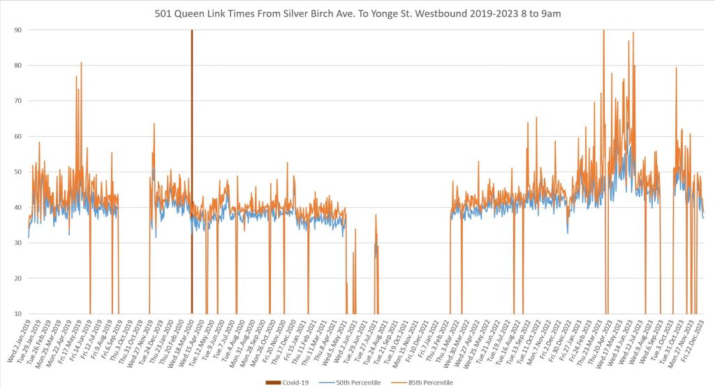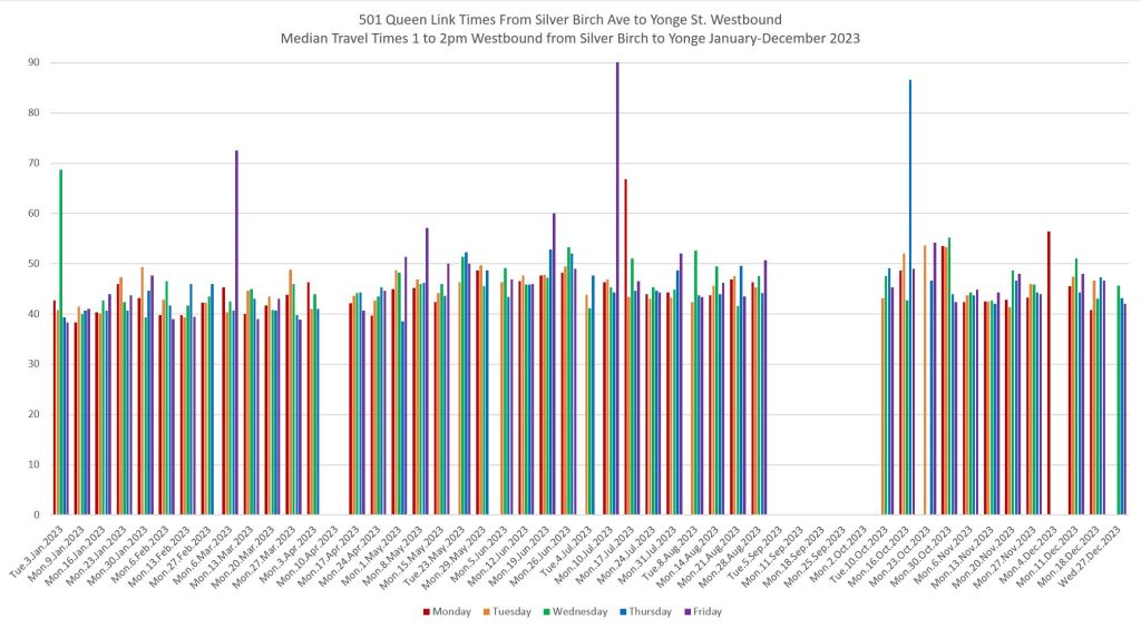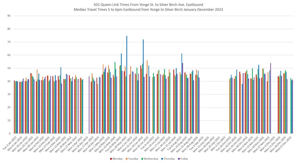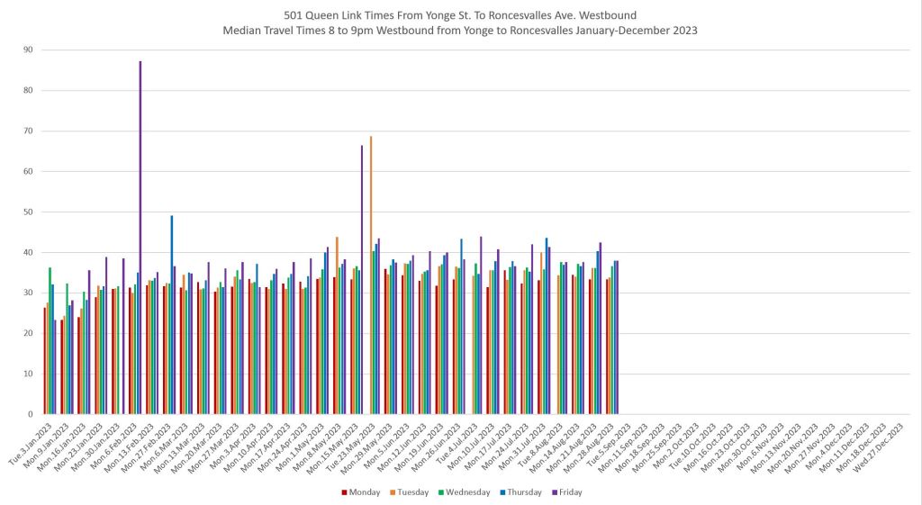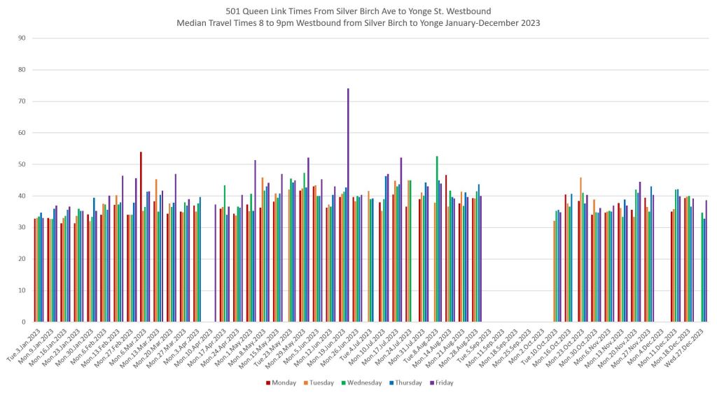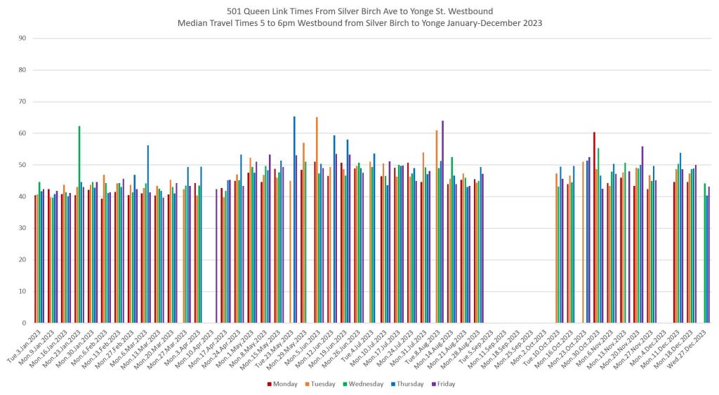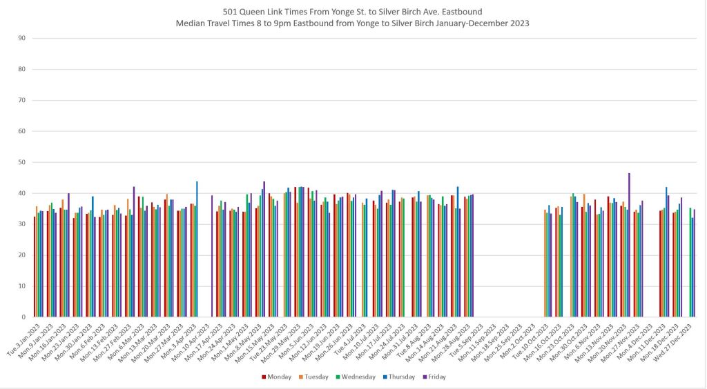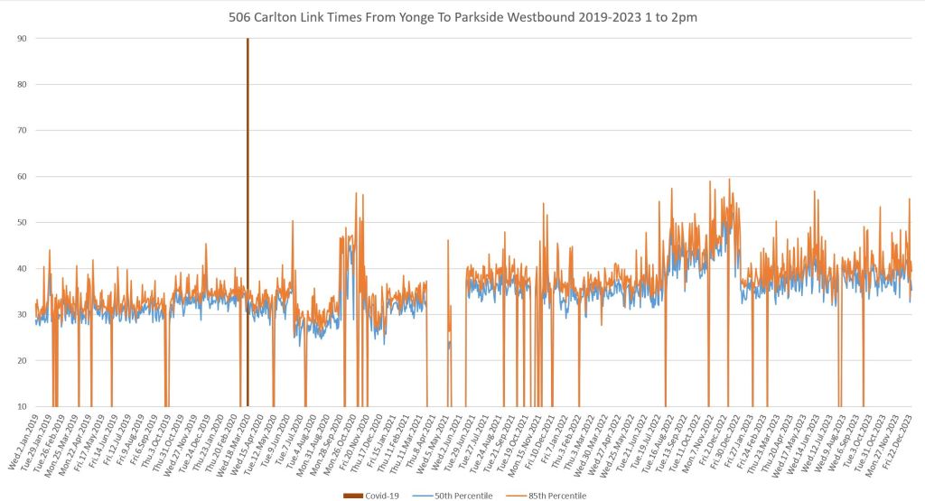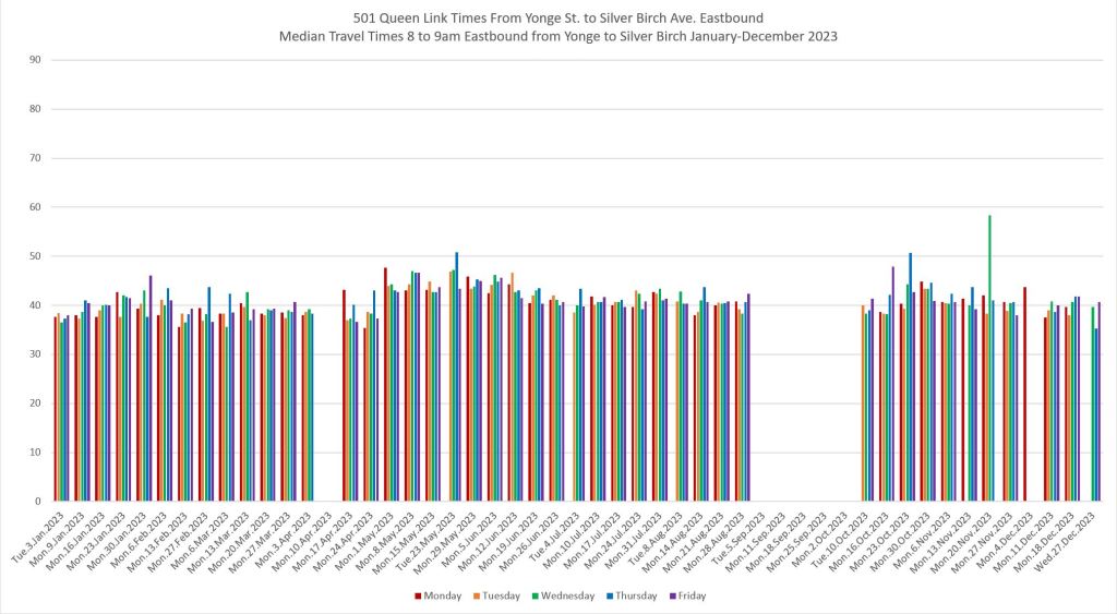 The eastern segment of 505 Dundas has not operated to Broadview Station during various construction projects including for much of 2023. I have not included hour-by-hour charts because, as one can see below, the travel times do not vary much in 2023.