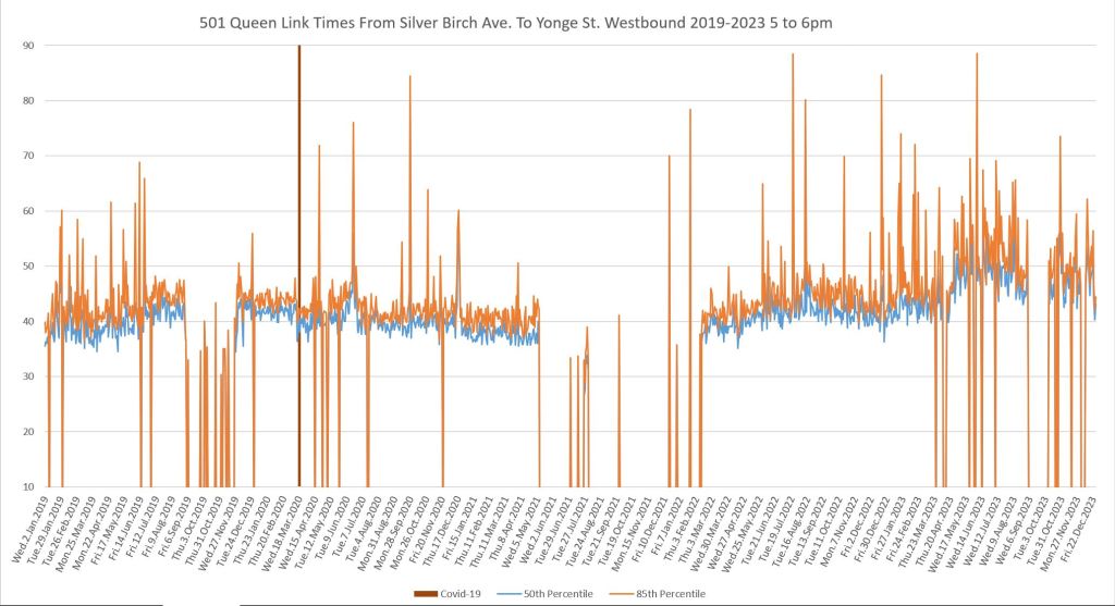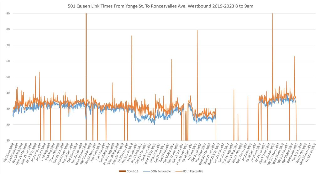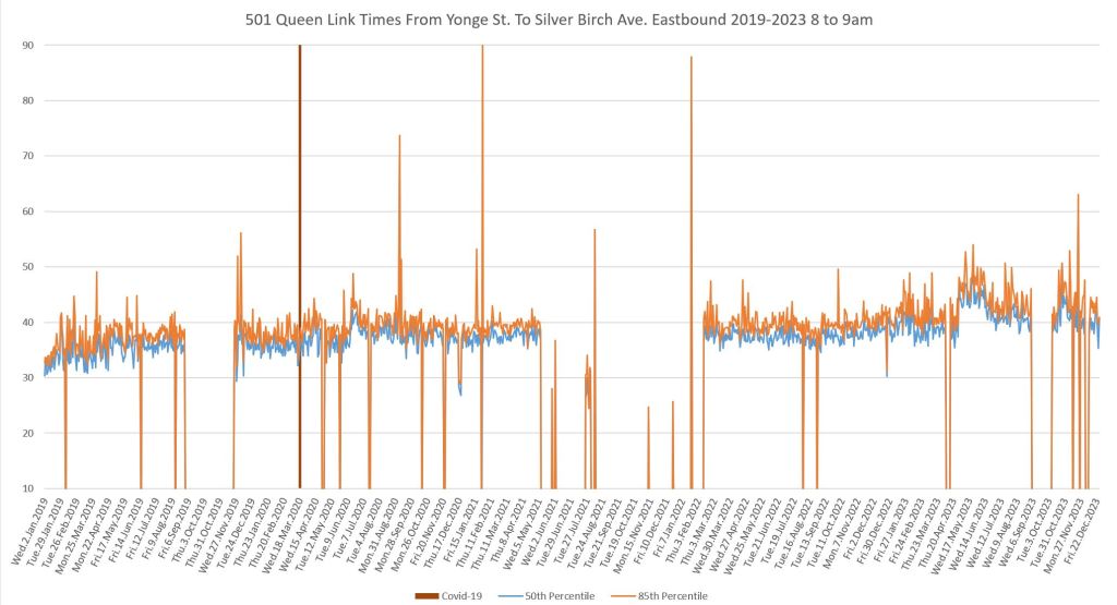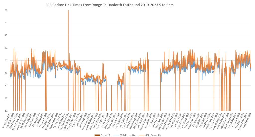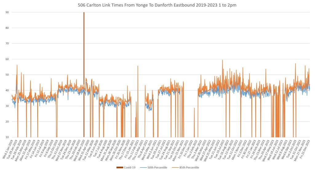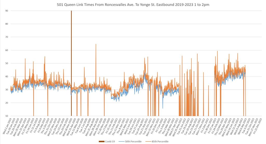 Travel times up to March 2020 reflect bus operation over the entire route, and streetcars returned in April 2020. There is a pandemic drop in travel times in March 2020 when buses were operating, but this is reversed with the return of streetcars in April. In previous articles, I have observed that buses run more quickly than streetcars on uncongested roads partly due to driving styles and partly due to TTC streetcar operating practices. However, on congested roads, travel times are determined by traffic conditions and stop service times.