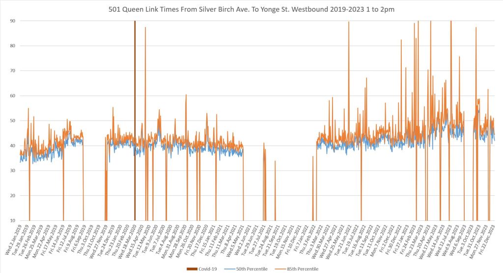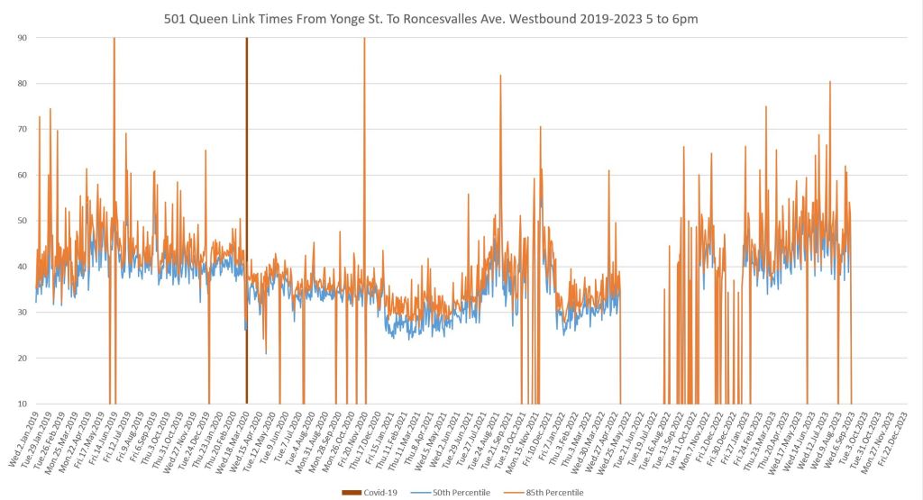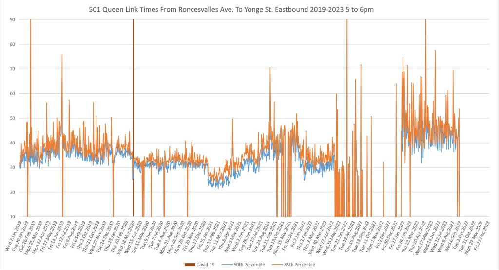 Travel times on the east side of Queen are more consistent than to the west, although westbound times were particularly bad in early 2023. The eastern portion of 501 Queen is considerably less congested than the western half, although there are a few specific problem locations.