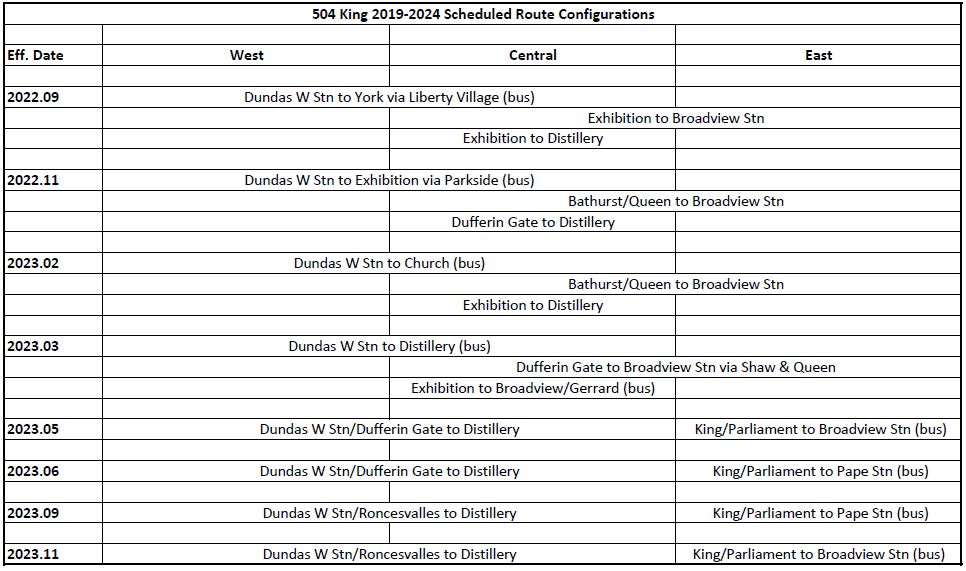 Like 501 Queen, 504 King has been through many route changes thanks to the KQQR project, Broadview reconstruction (in two phases rather than one), and trackwork at King and Shaw, among other disruptions. Listed here are only the scheduled route changes, not the ad hoc diversions to deal with short-term issues.