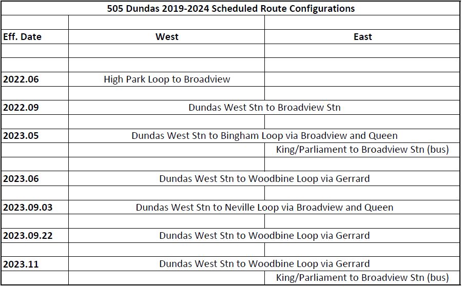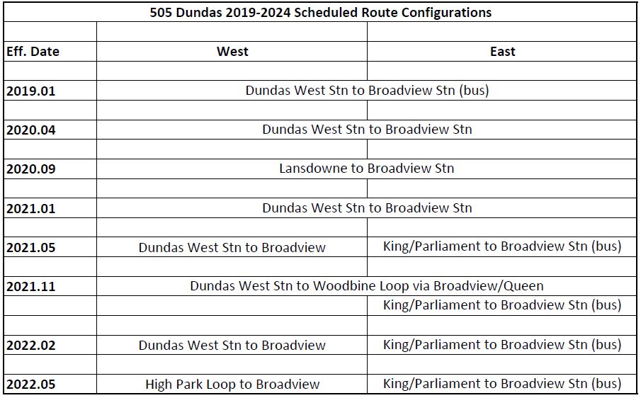 505 Dundas was operated with buses until April 2020 due to a shortage of streetcars. The route has seen changes to its eastern and western termini especially from 2021 onward.