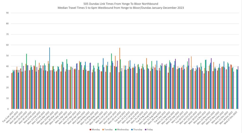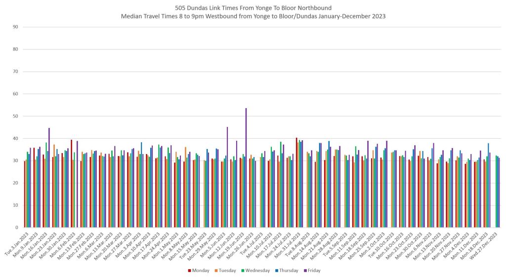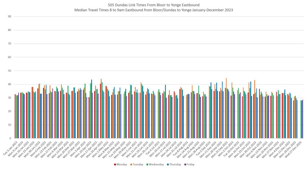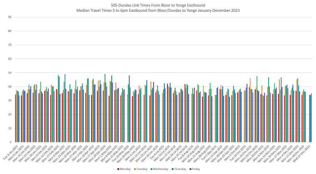 Day-by-day travel times in 2023 for 505 Dundas do not change much and show somewhat less midweek peaking than on other routes. Evening travel times are higher on Fridays.