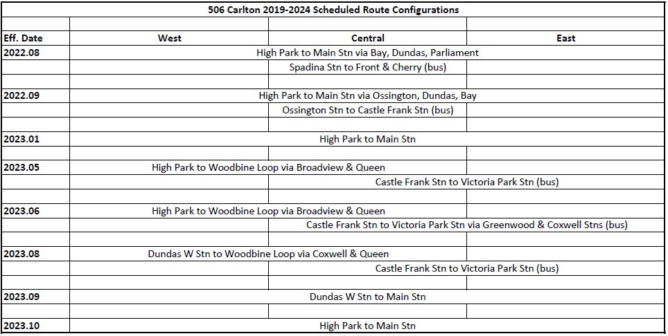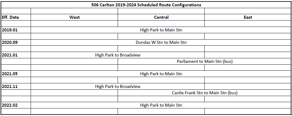 The 506 Carlton car runs from High Park Loop to Main Street Station, and it operated on its normal route in January in both 2019 and 2024. Carlton saw various changes over the years, but not quite as many as the other routes above. Not shown in the chart below is a small number of trippers that operated in the AM peak with buses because of the streetcar shortage. These were discontinued in November 2021.