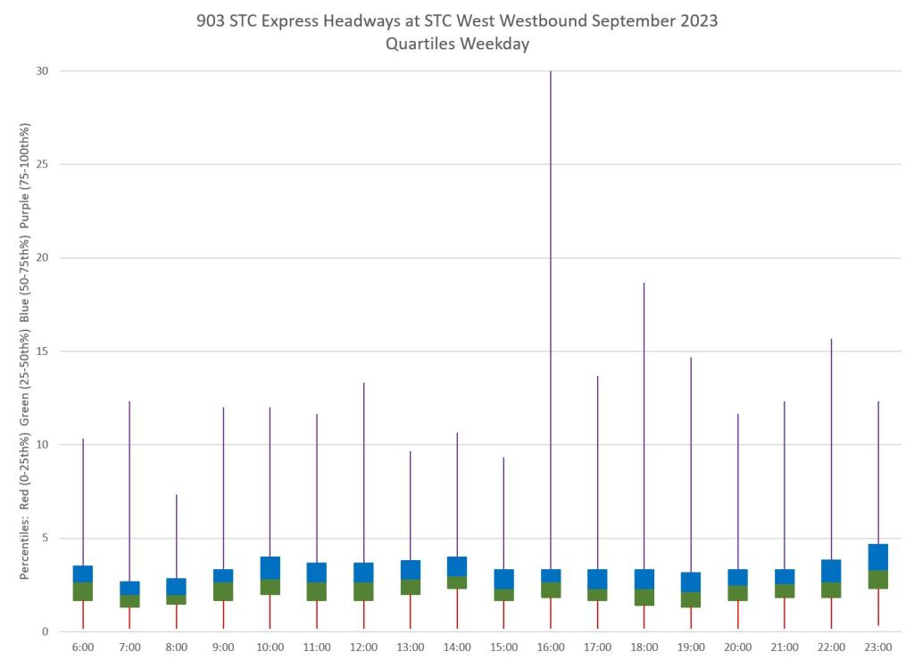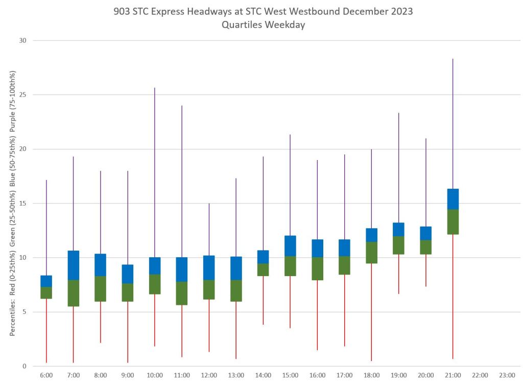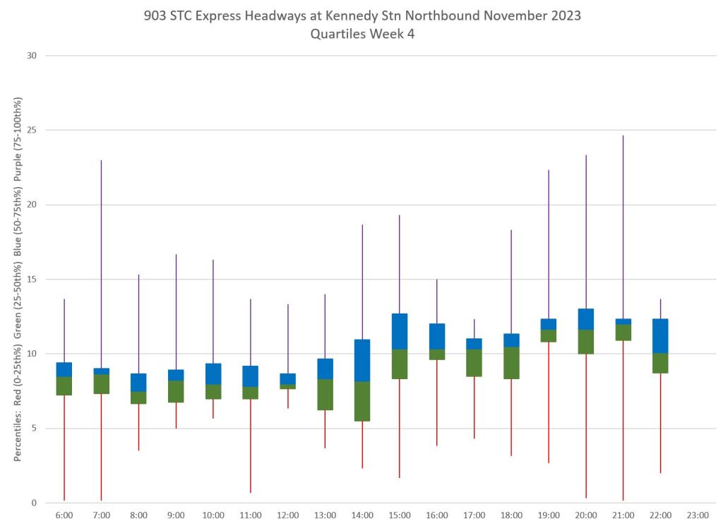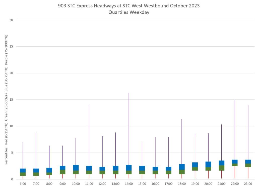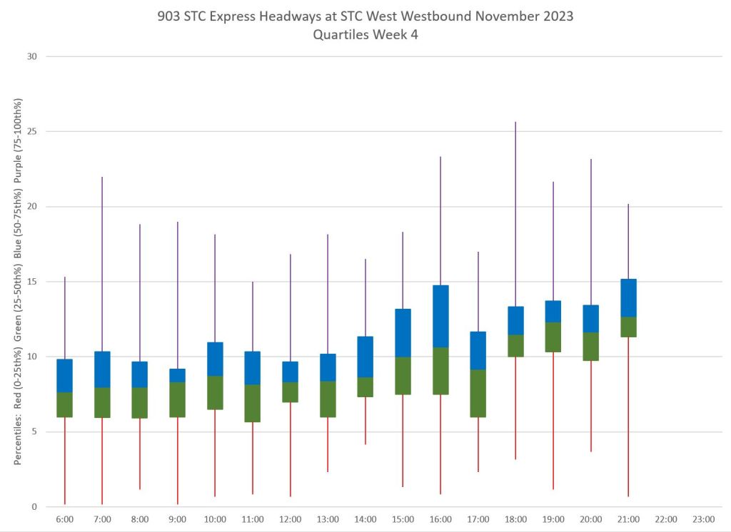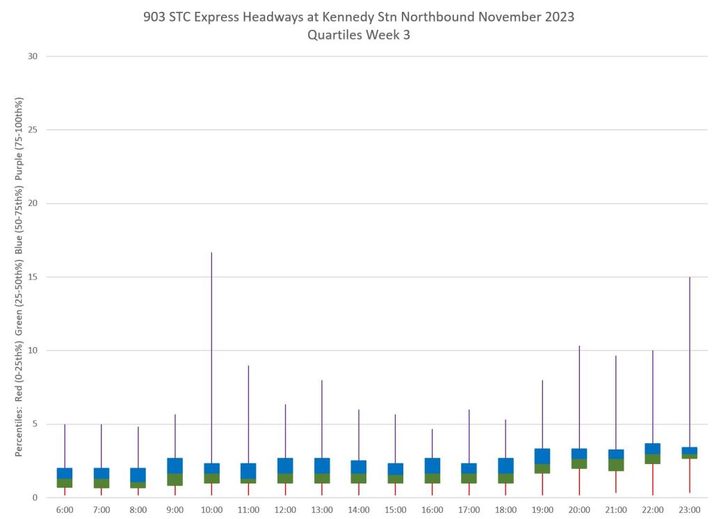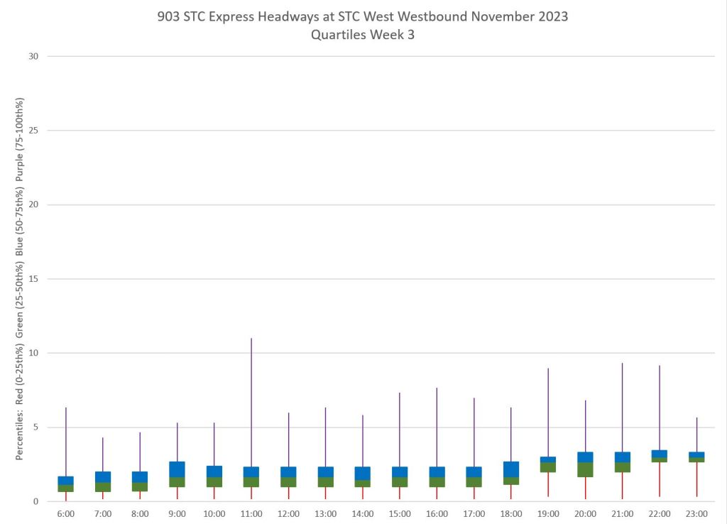Headways leaving STC westbound echo the pattern of service northbound from Kennedy Station. However, the middle percentile boxes following the November route change are noticeably wider. This is not just a case of a new schedule, but of the extension of the 903 express to replace the 934 913 Progress Express. STC is now a mid-route stop, not a terminal, and is subject to whatever traffic and other factors affect operations east of STC.