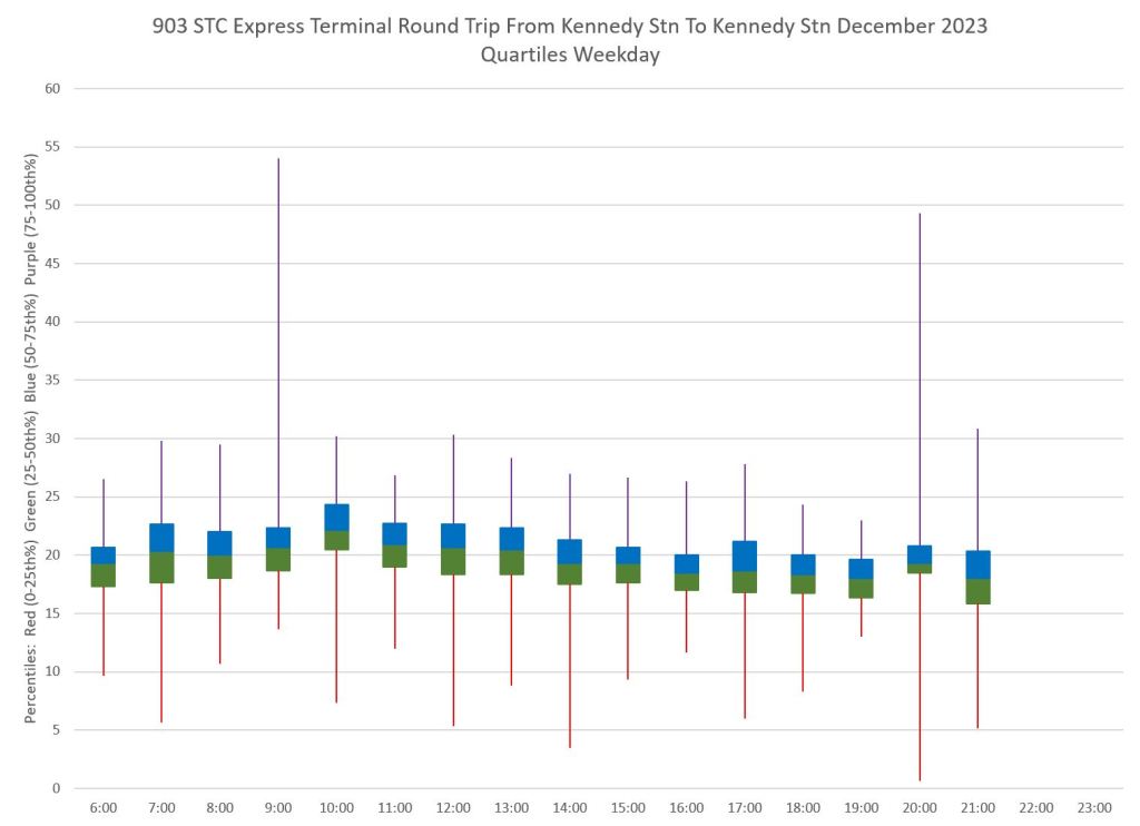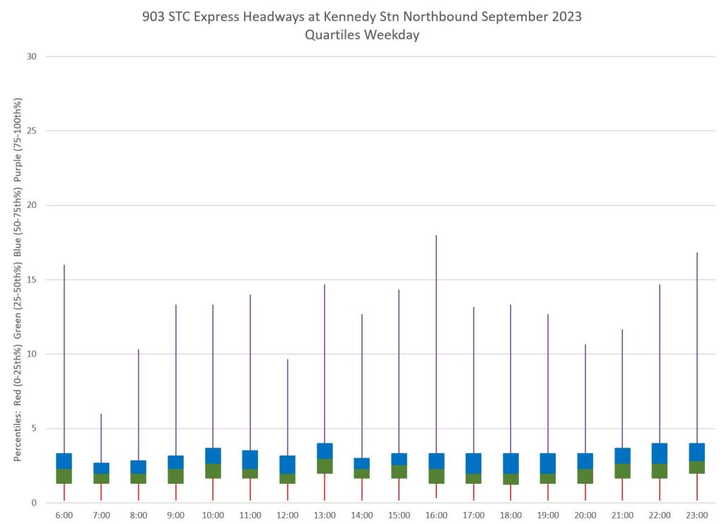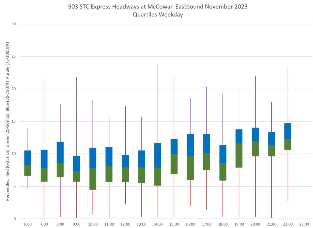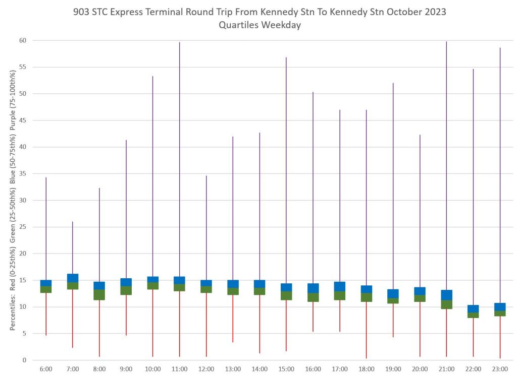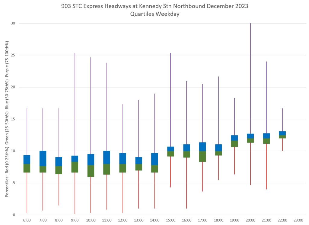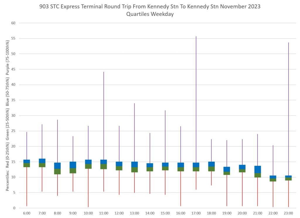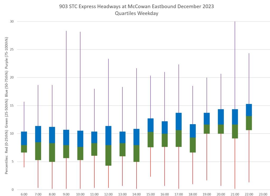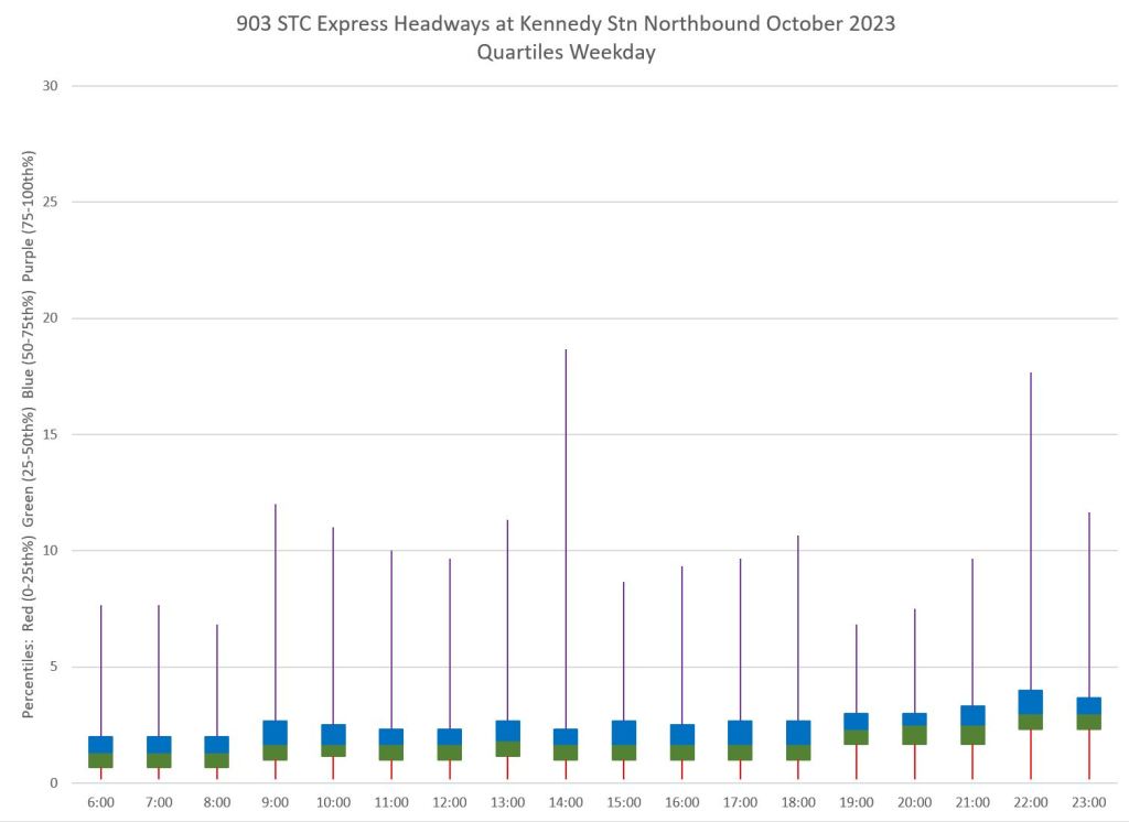 Headways leaving STC westbound echo the pattern of service northbound from Kennedy Station. However, the middle percentile boxes following the November route change are noticeably wider. This is not just a case of a new schedule, but of the extension of the 903 express to replace the 934 913 Progress Express. STC is now a mid-route stop, not a terminal, and is subject to whatever traffic and other factors affect operations east of STC.