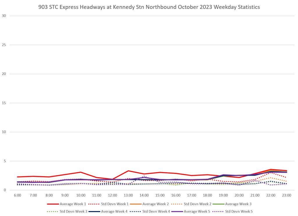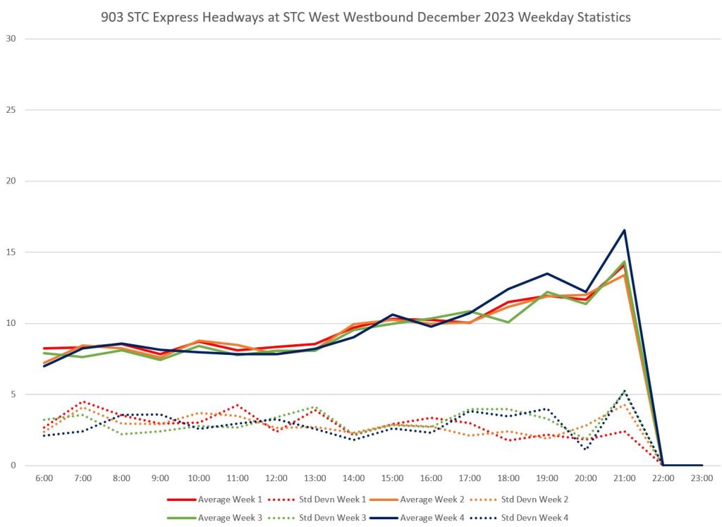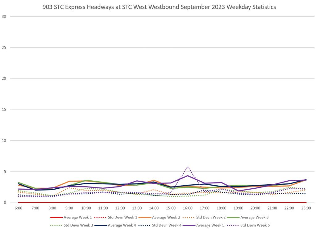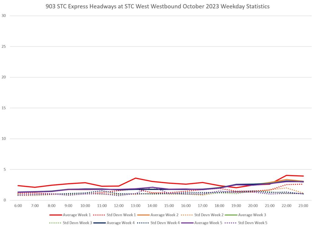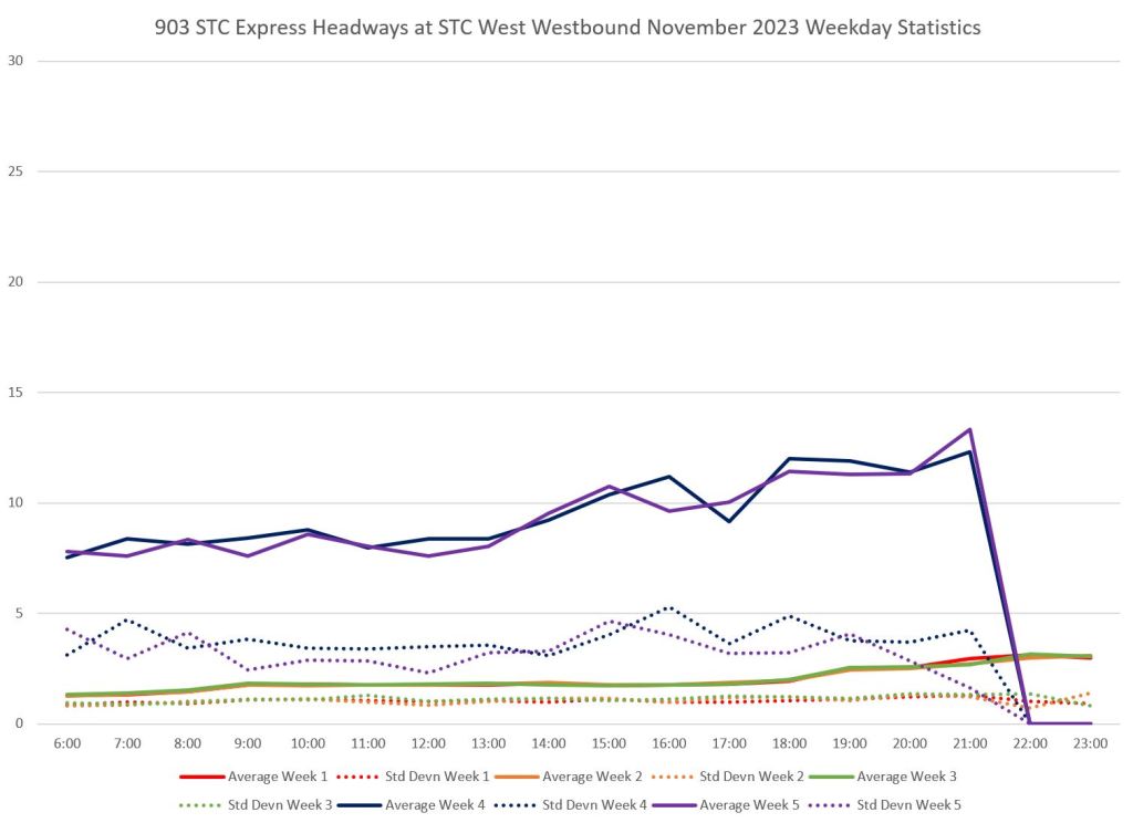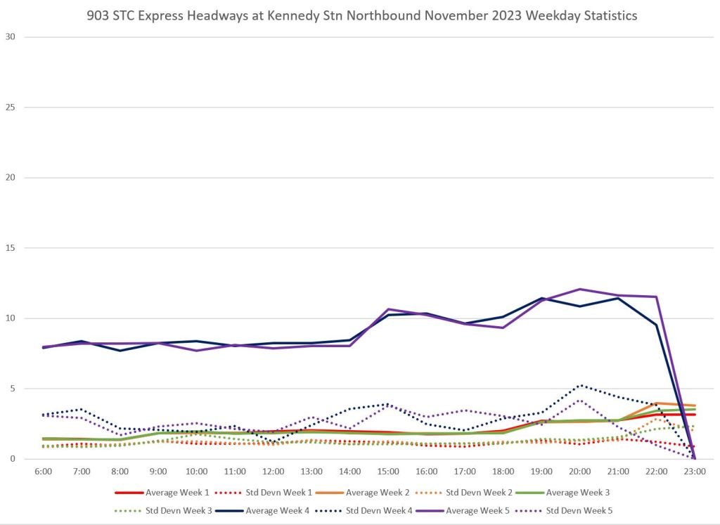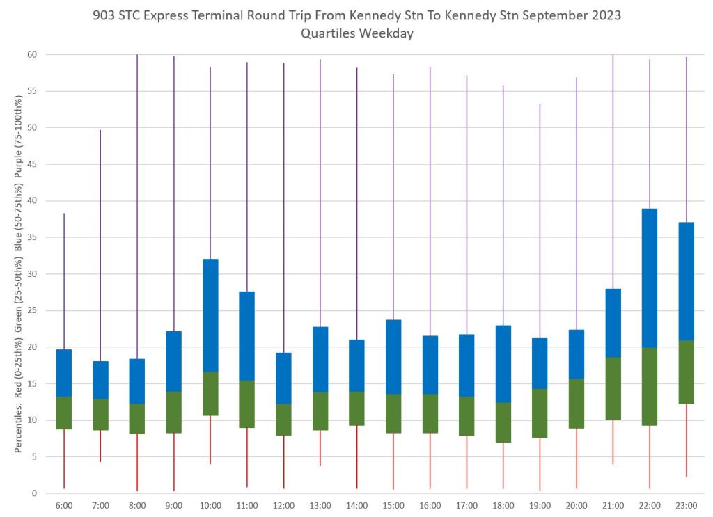 Headways leaving STC westbound echo the pattern of service northbound from Kennedy Station. However, the middle percentile boxes following the November route change are noticeably wider. This is not just a case of a new schedule, but of the extension of the 903 express to replace the 934 913 Progress Express. STC is now a mid-route stop, not a terminal, and is subject to whatever traffic and other factors affect operations east of STC.