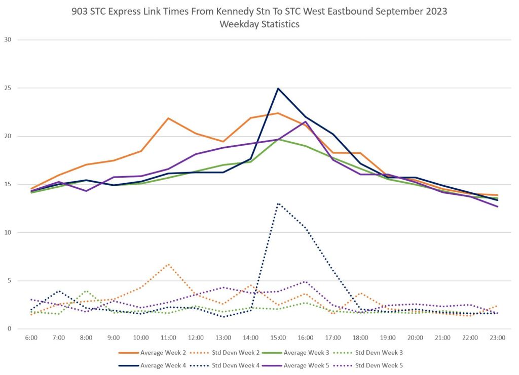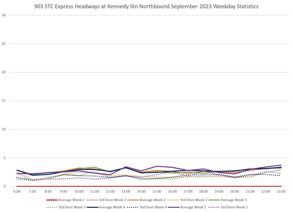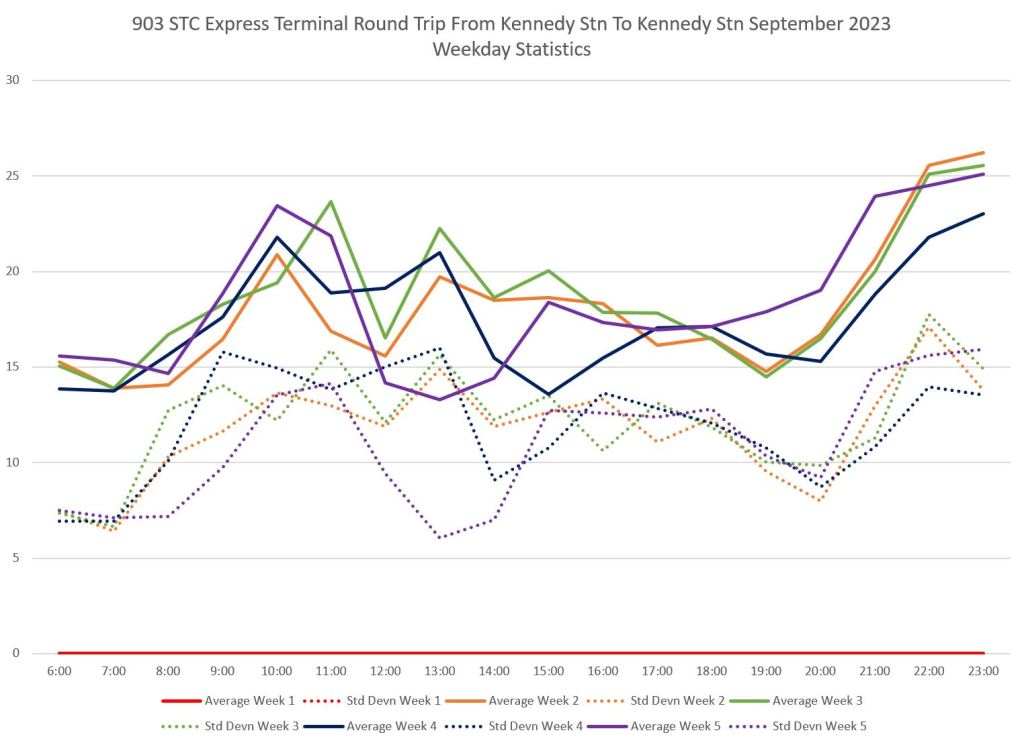 (Week 1 has no data because this is before the Labour Day weekend when the 903 buses became trackable.)
