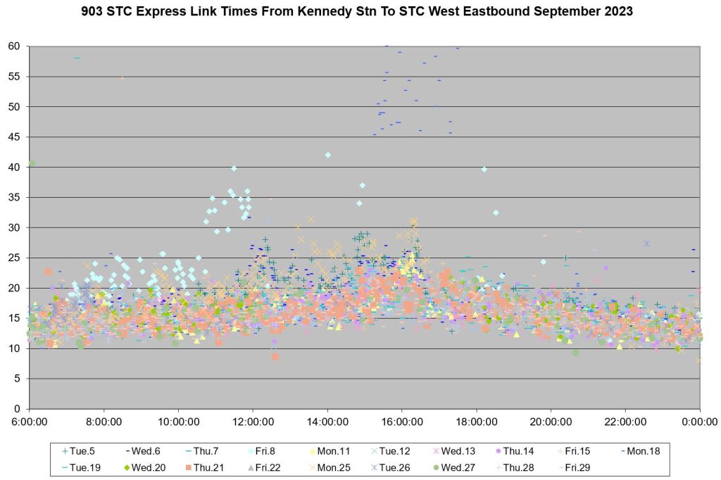 The estimated travel time from STC to Kennedy for the September configuration was 18-25 minutes. Note that this includes the access times at both ends compared to the charted values shown earlier where the screenlines are outside of the stations to capture only travel time, not any extraneous movement within the terminals.