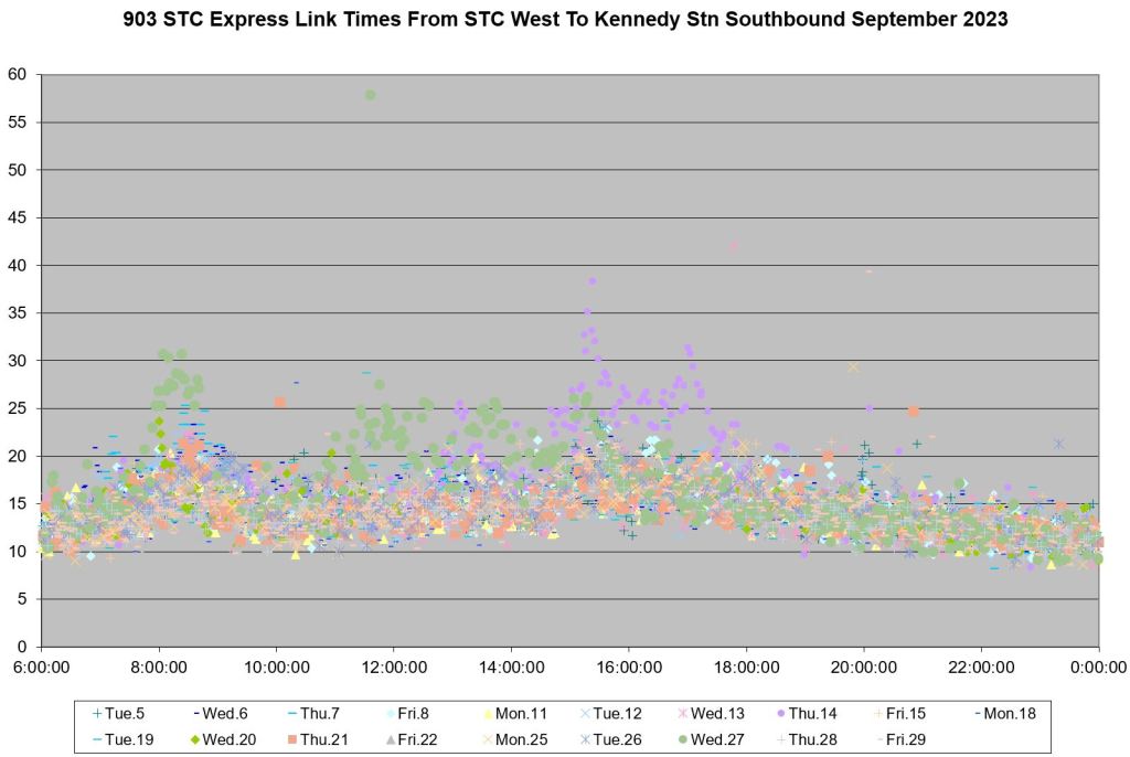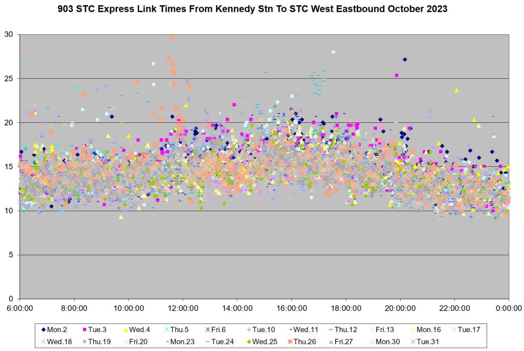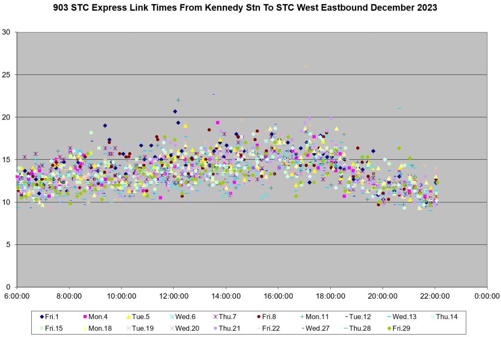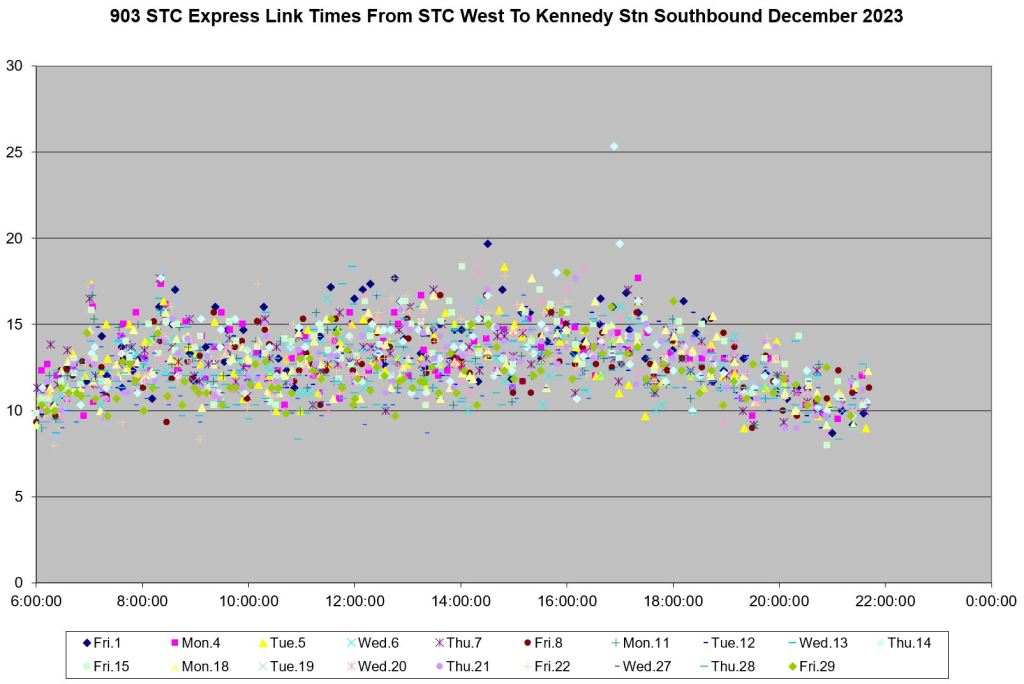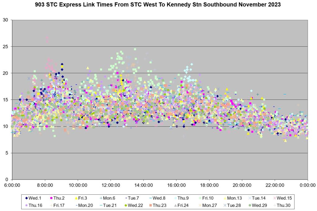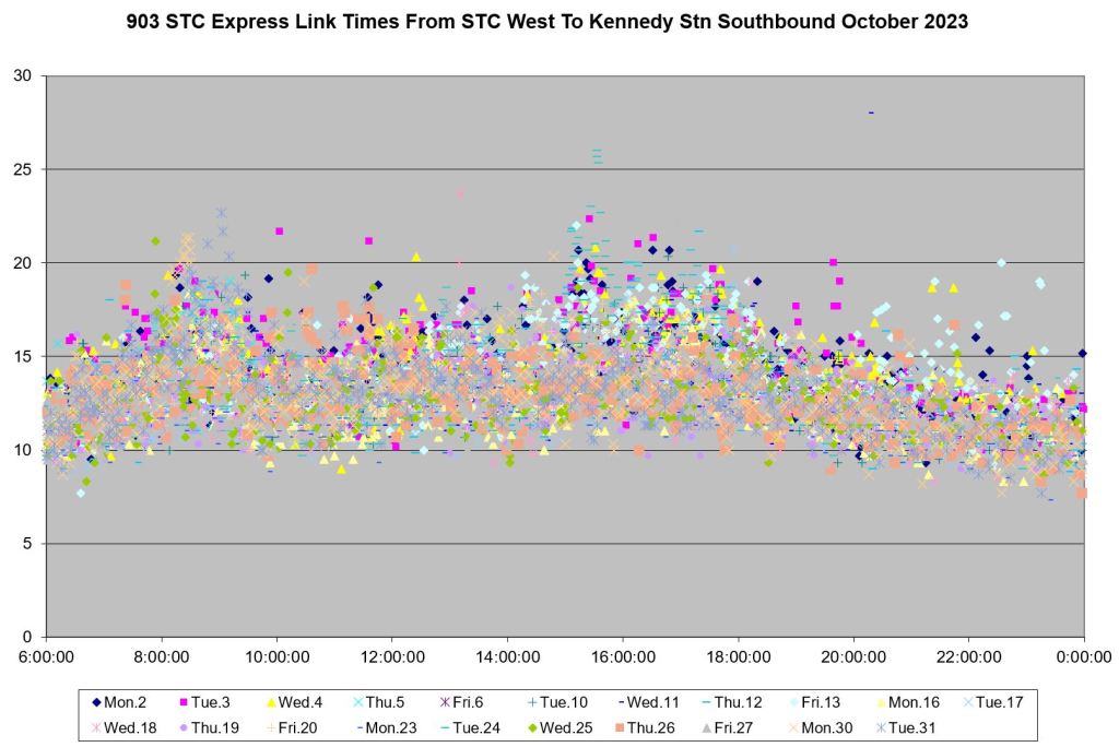 Note that part of the time saving relative to SRT operation and the early days of 903 buses comes from elimination of the transfer connection at STC.