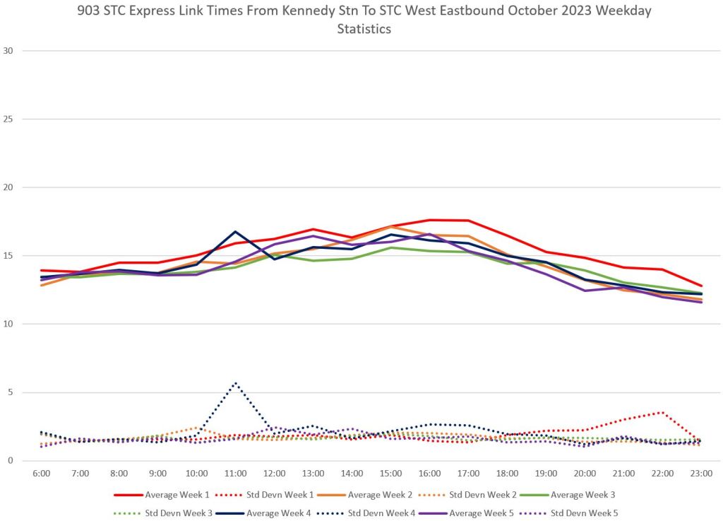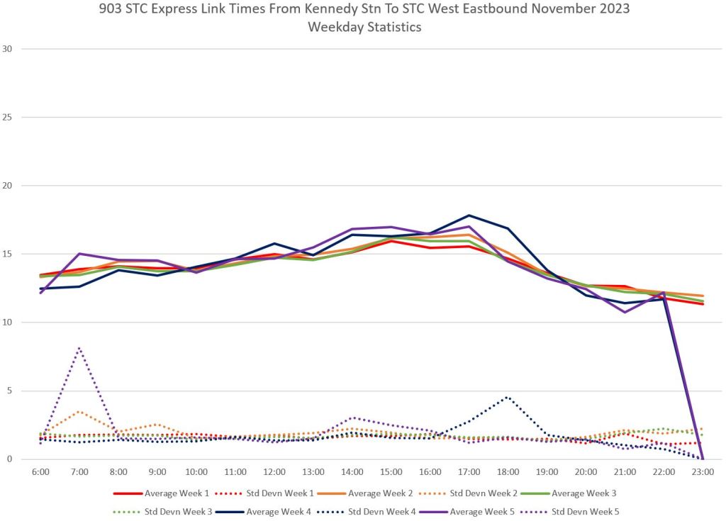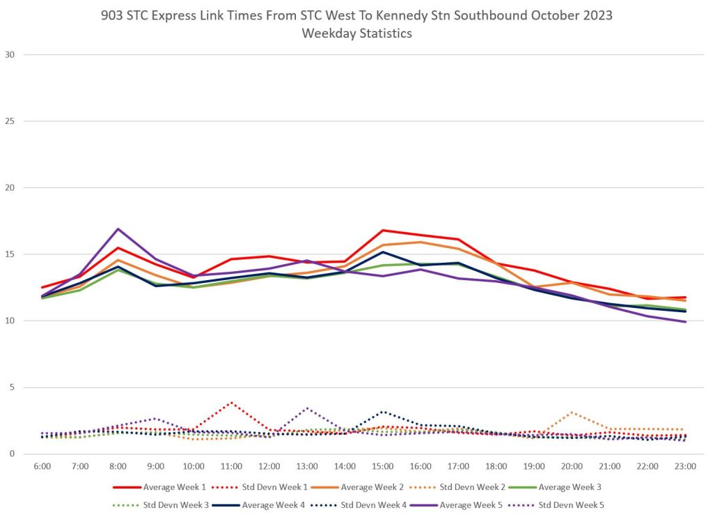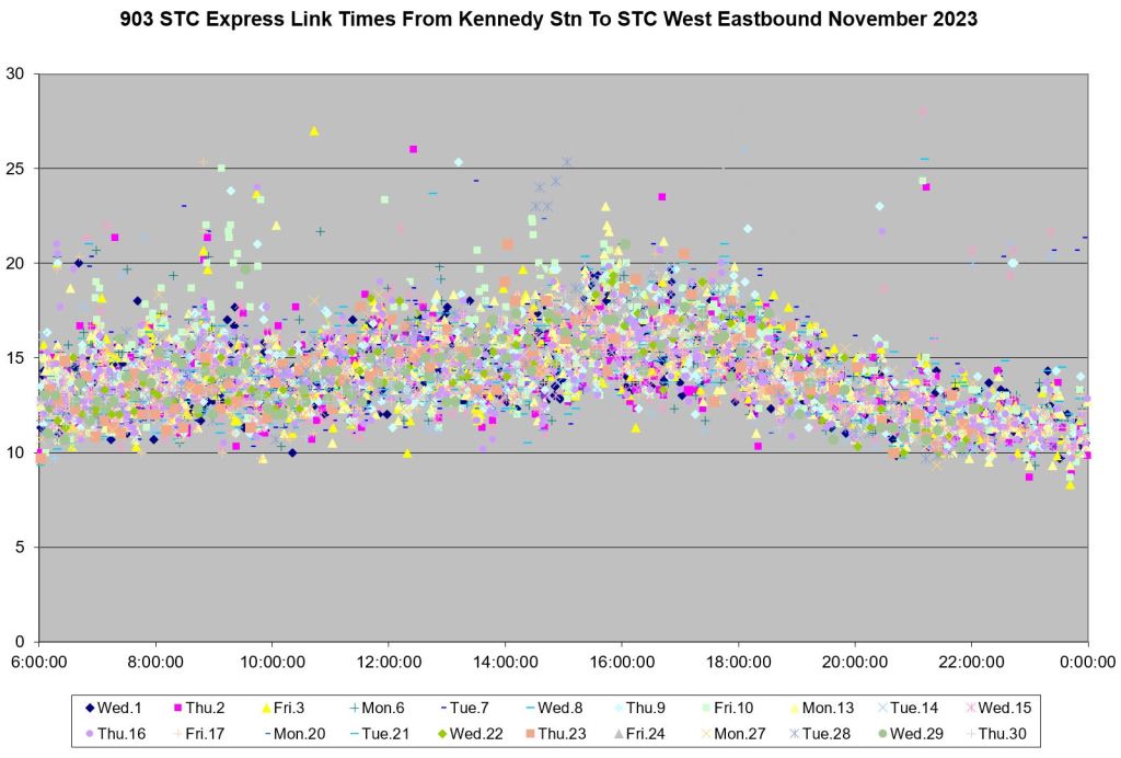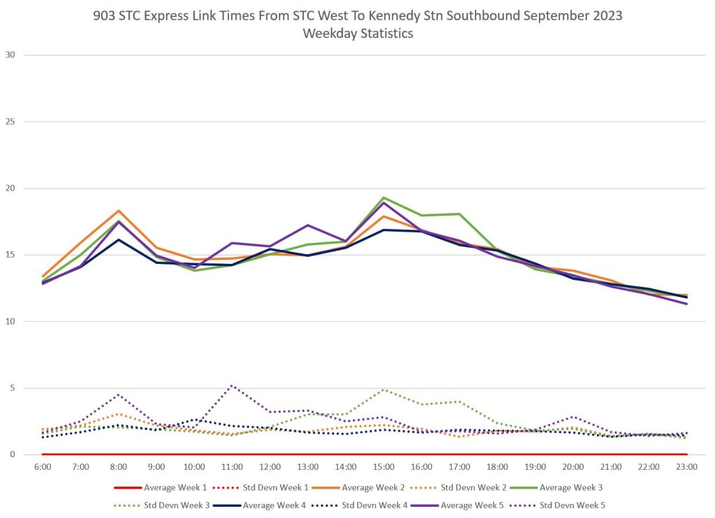 Note that part of the time saving relative to SRT operation and the early days of 903 buses comes from elimination of the transfer connection at STC.