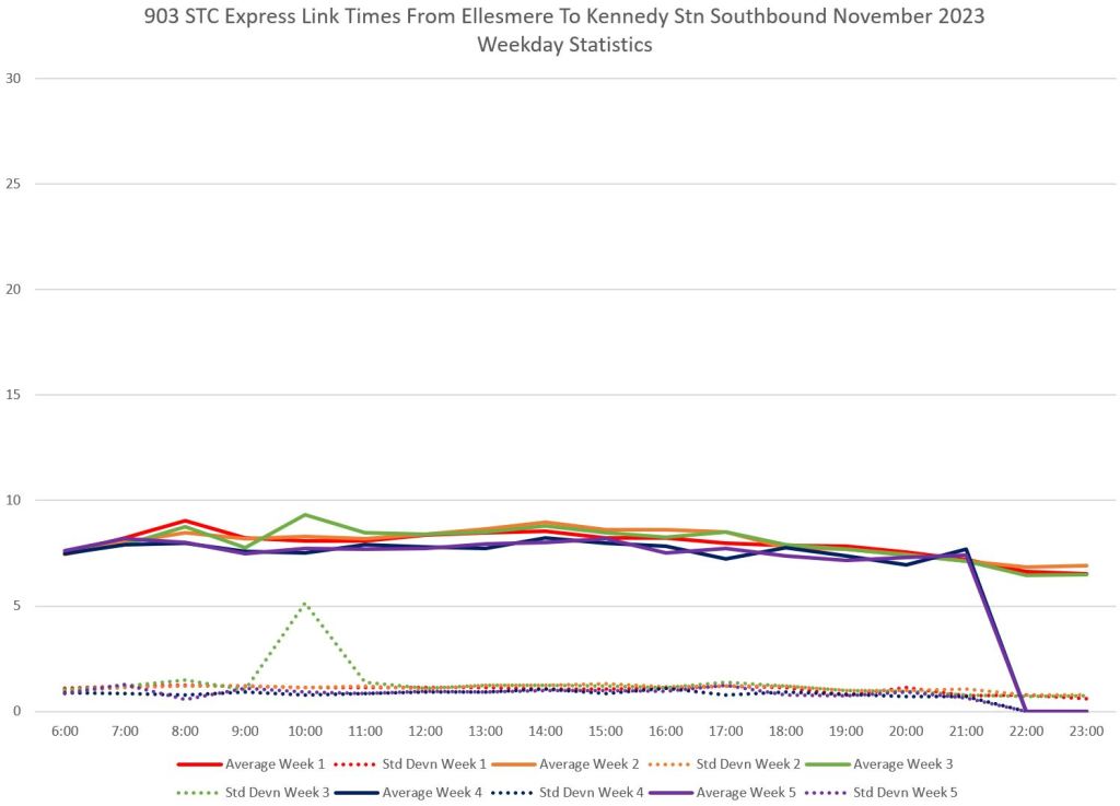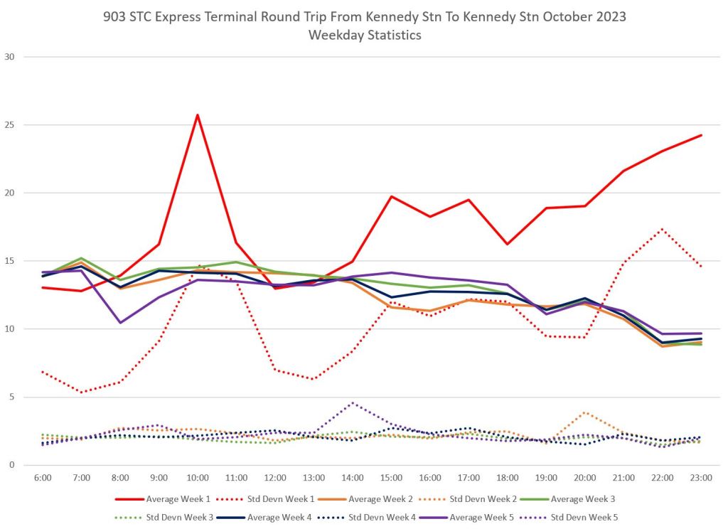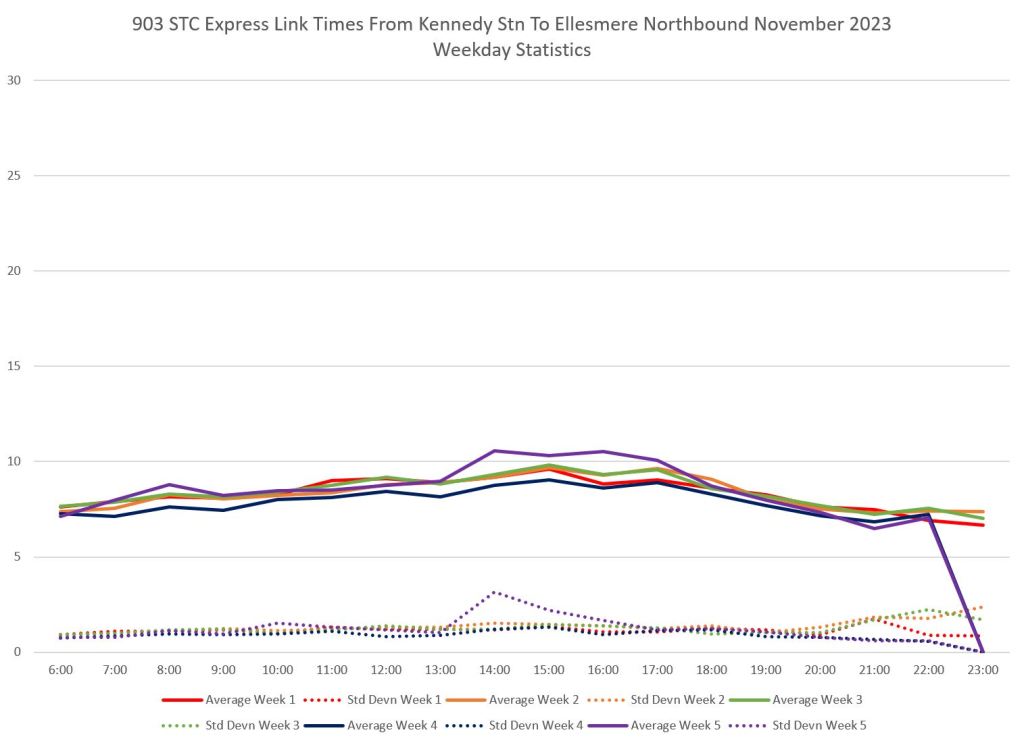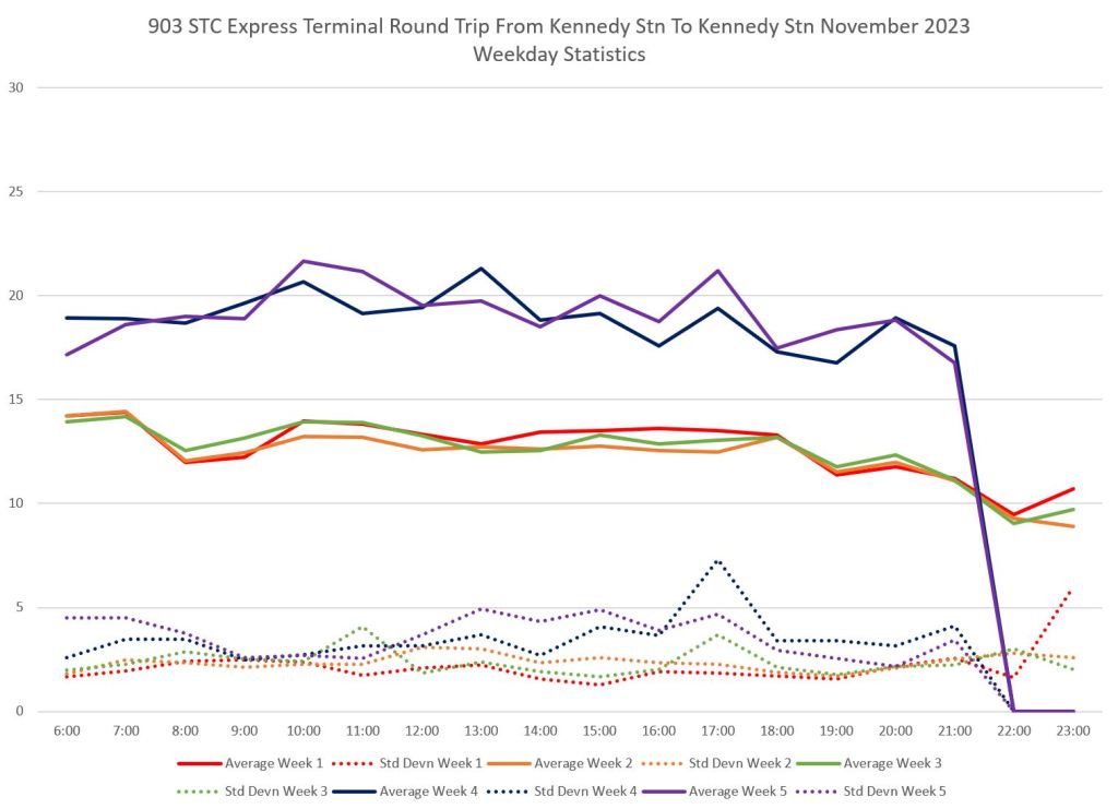 November shows an abrupt jump in terminal times in weeks 4 and 5. This comes from the full implementation of transit priority and the shift to the route via Ellesmere. Buses make the trip faster, and have longer terminal layovers as a result.