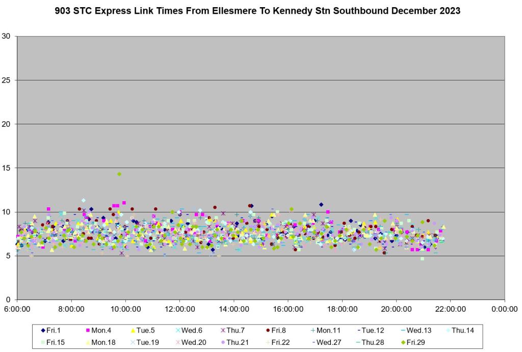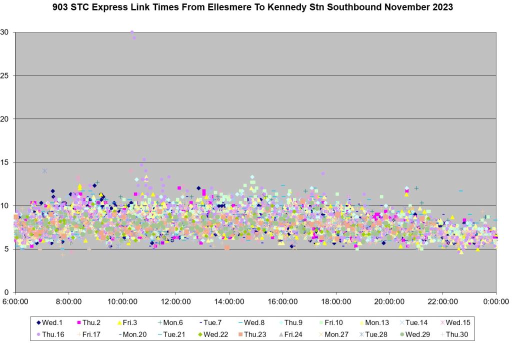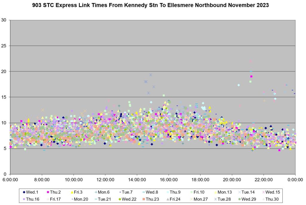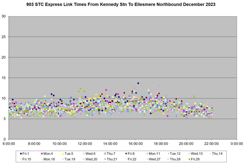 The charts below show the travel times between Ellesmere and Kennedy Station via Kennedy northbound and via Midland southbound for November and December. The values vary little over the day, and individual trips lie in a band from roughly 5 to 10 minutes concentrated around the average (the standard deviation is about 1 minute).