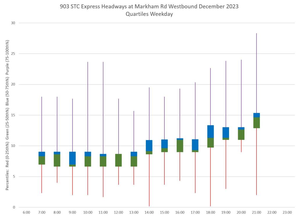 Note that the central blocks in the quartile chart (25th to 75th percentile) are wider in Week 4, not just shifted upward, and the tails for low and high values have also grown. This shows that at a headway more like a “normal” route (8-12 minutes), the 903 behaves like most routes with less reliable service.