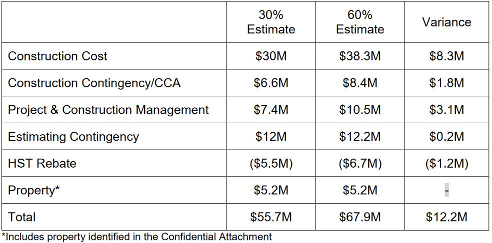 Total cost is now forecast at $67.9 million, up $12.2 million from the earlier estimate of $55.7 million which is part of the TTC’s 2024 Capital Budget. Of this, $4.3 million is due to the Metrolinx barrier, and $4 million goes for a grab-bag of items that appear to have been omitted in the original estimate. This increase is compounded by other cost lines which are calculated as a percentage of the base.