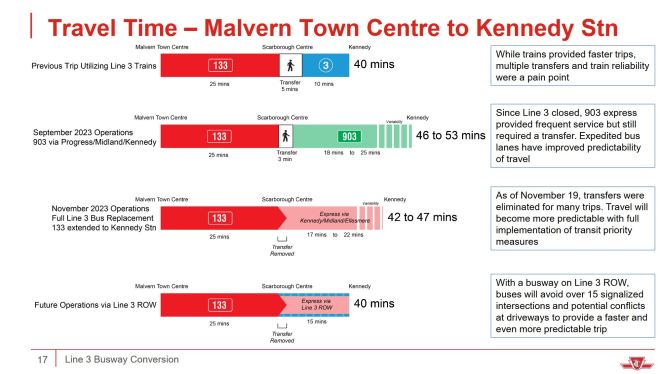 This proposed busway will not be required once subway in operation to Town Centre in few years. Just not worth the cost. TTC just pissing money away again.