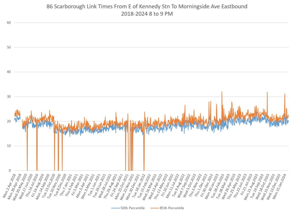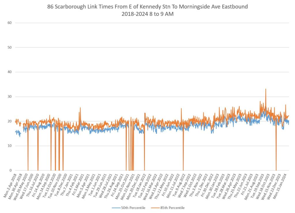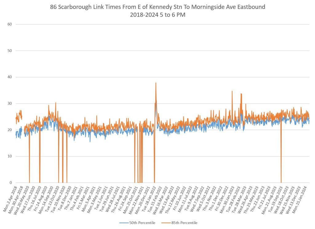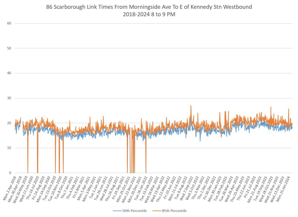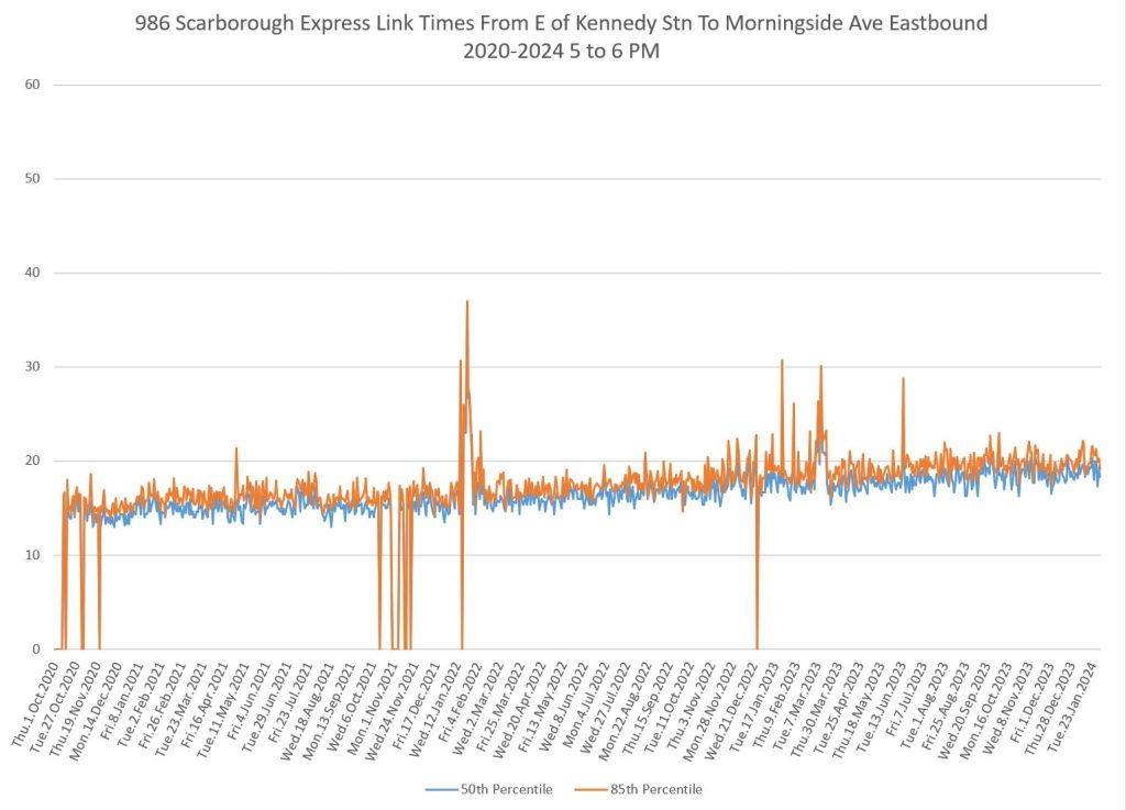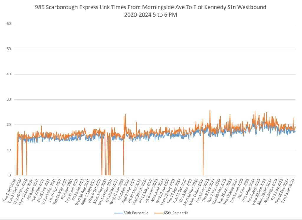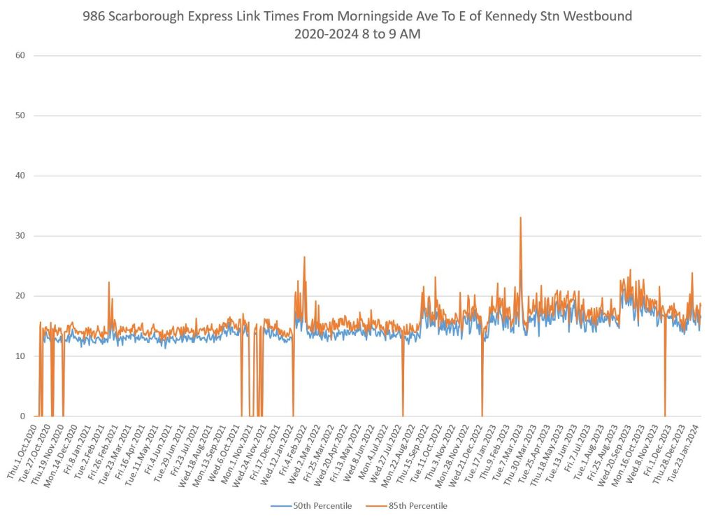 In the case of routes already operating on red lanes in Scarborough (86/986 Scarborough, 116 Morningside and 905 Eglinton East Express), travel times have grown since 2020, but it is impossible to know how much they might have grown in the absence of transit priority measures other than by analogy to other corridors where conditions might not match.