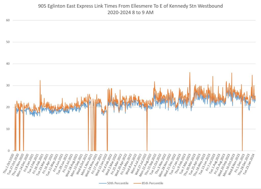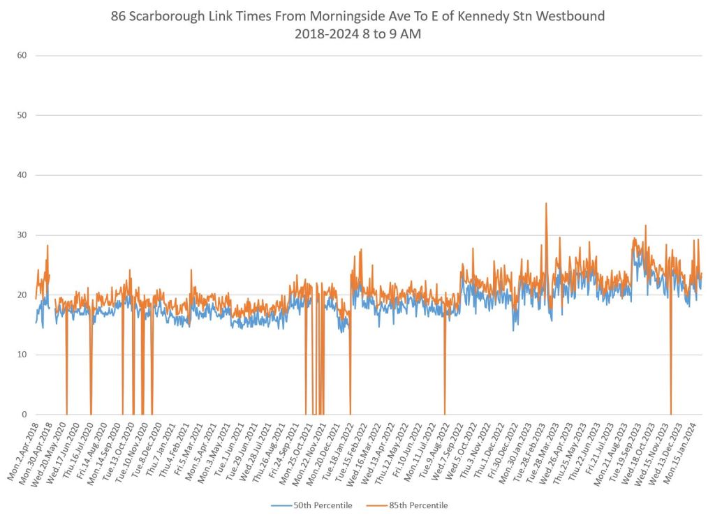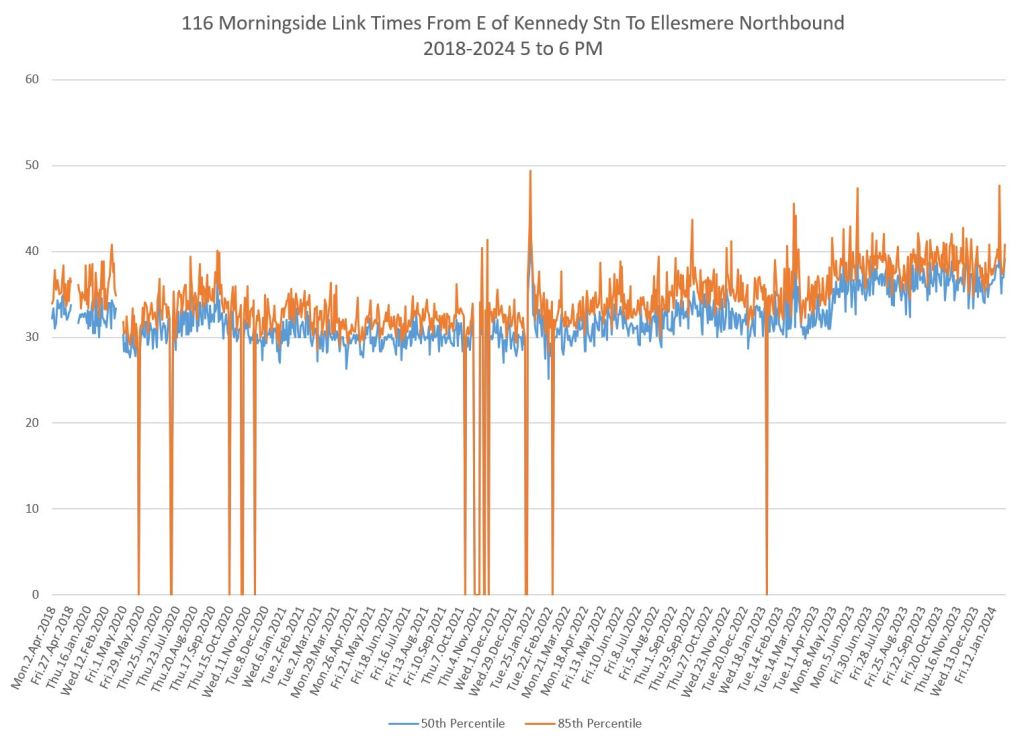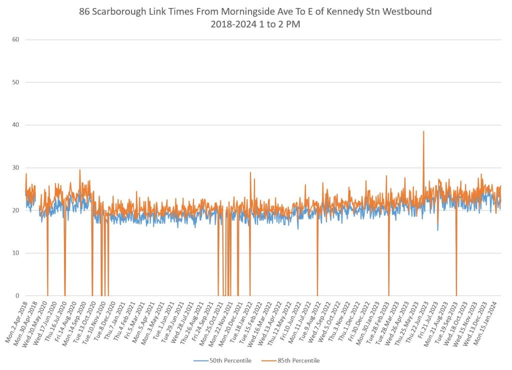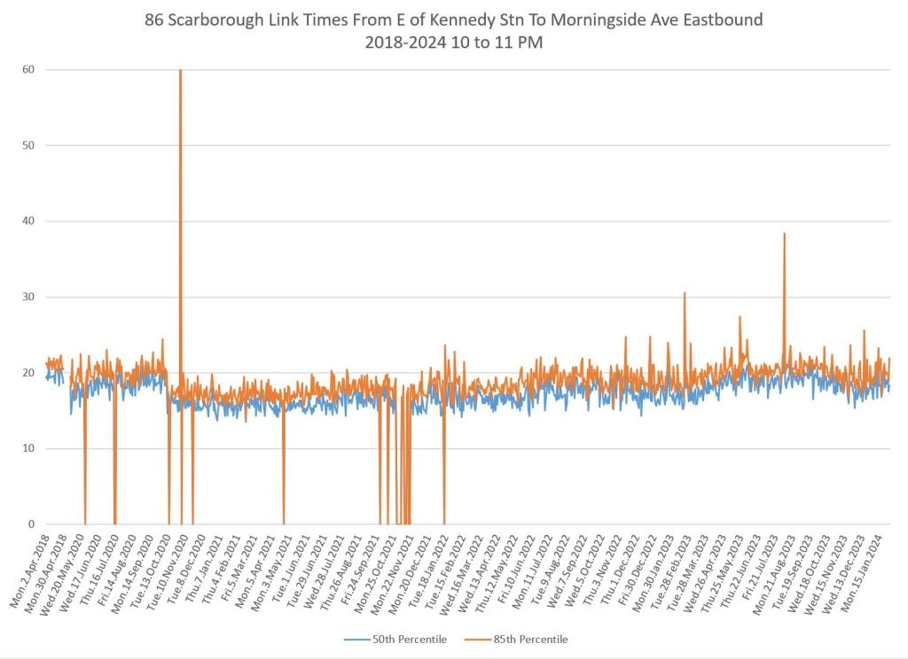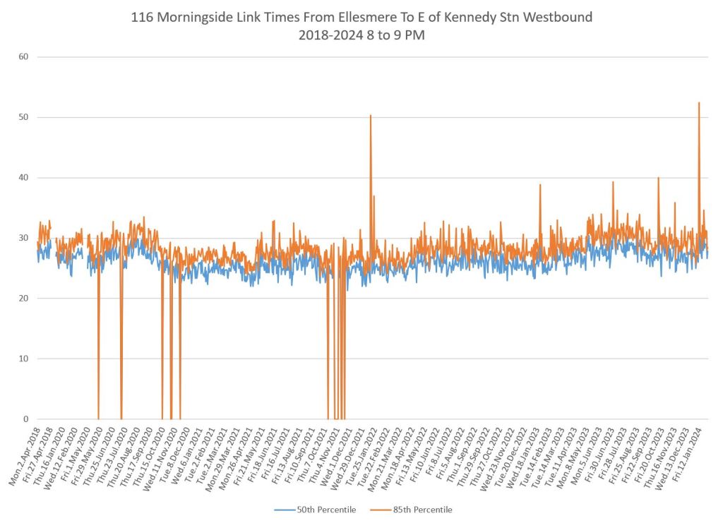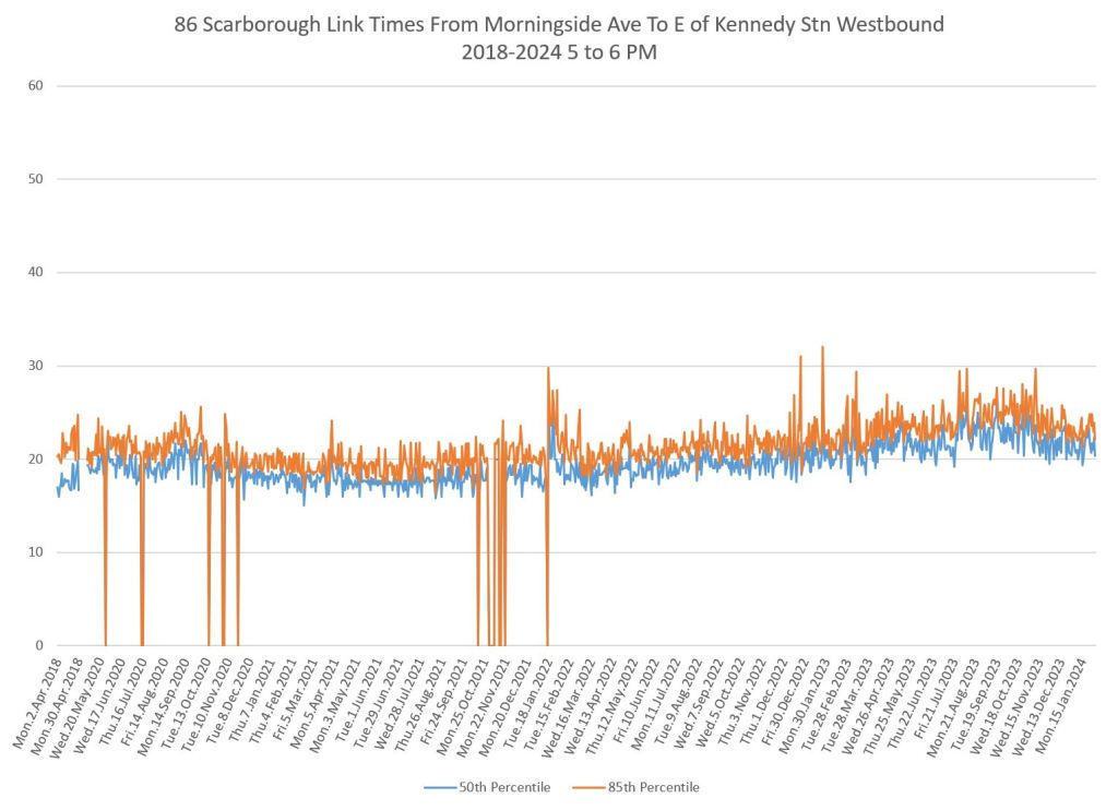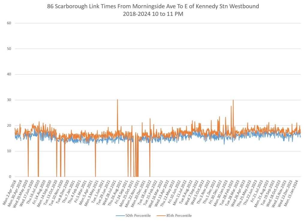 In the case of routes already operating on red lanes in Scarborough (86/986 Scarborough, 116 Morningside and 905 Eglinton East Express), travel times have grown since 2020, but it is impossible to know how much they might have grown in the absence of transit priority measures other than by analogy to other corridors where conditions might not match.