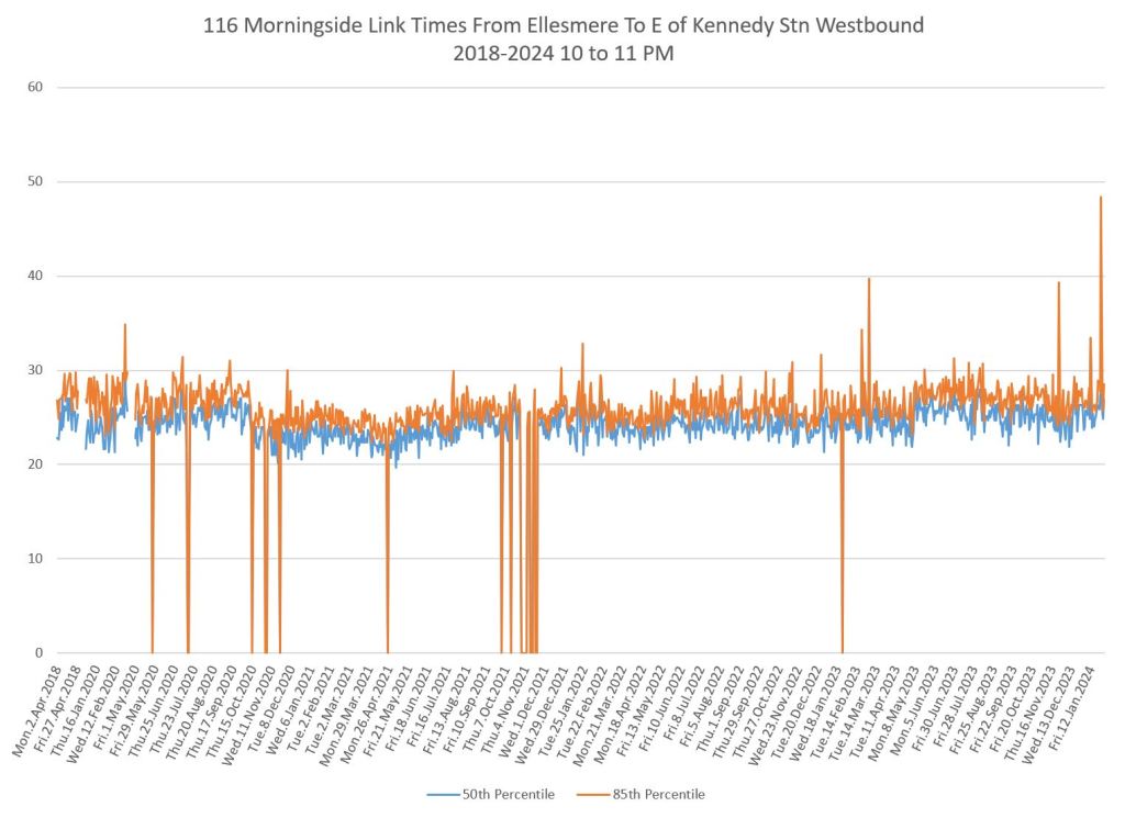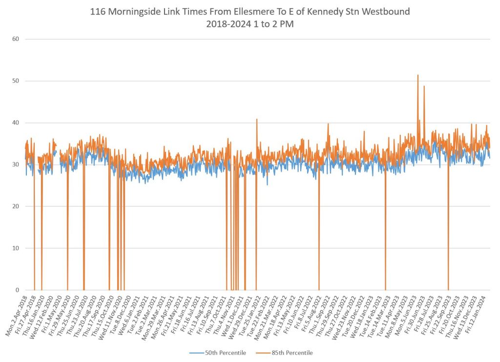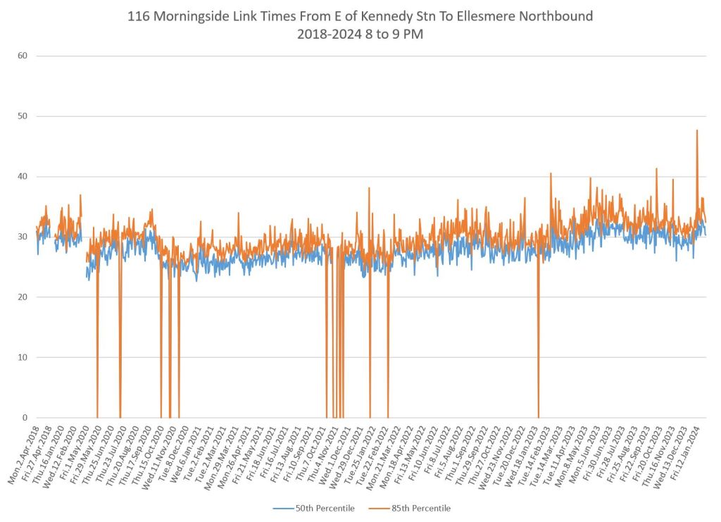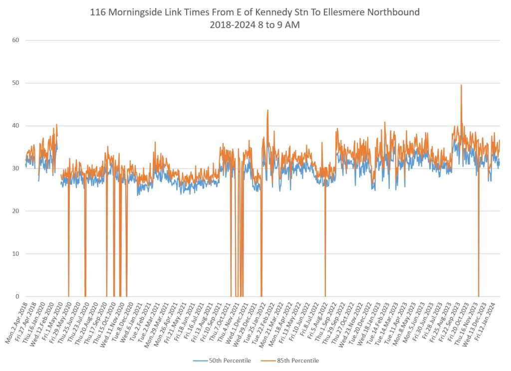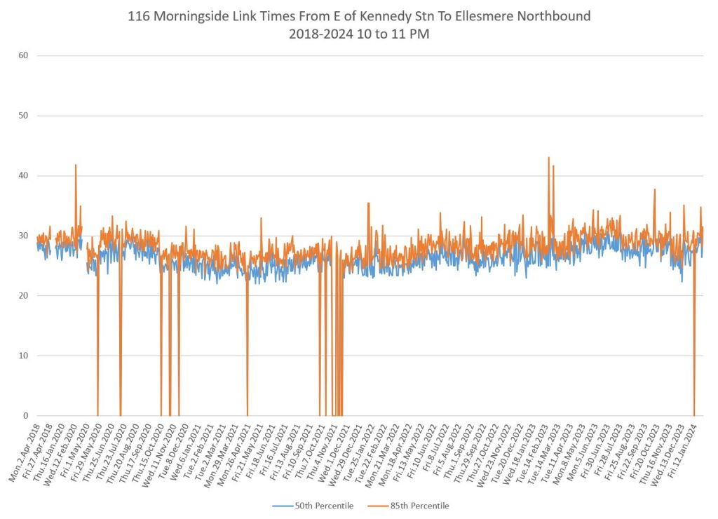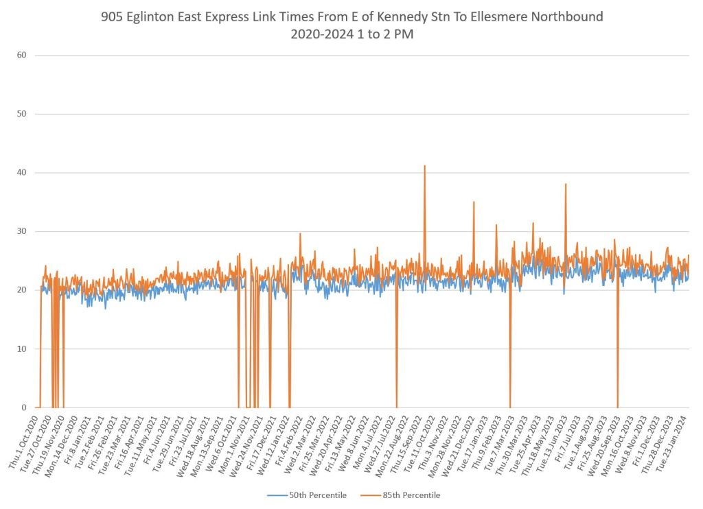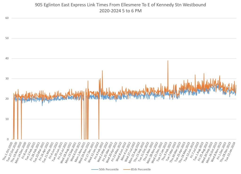 In the case of routes already operating on red lanes in Scarborough (86/986 Scarborough, 116 Morningside and 905 Eglinton East Express), travel times have grown since 2020, but it is impossible to know how much they might have grown in the absence of transit priority measures other than by analogy to other corridors where conditions might not match.