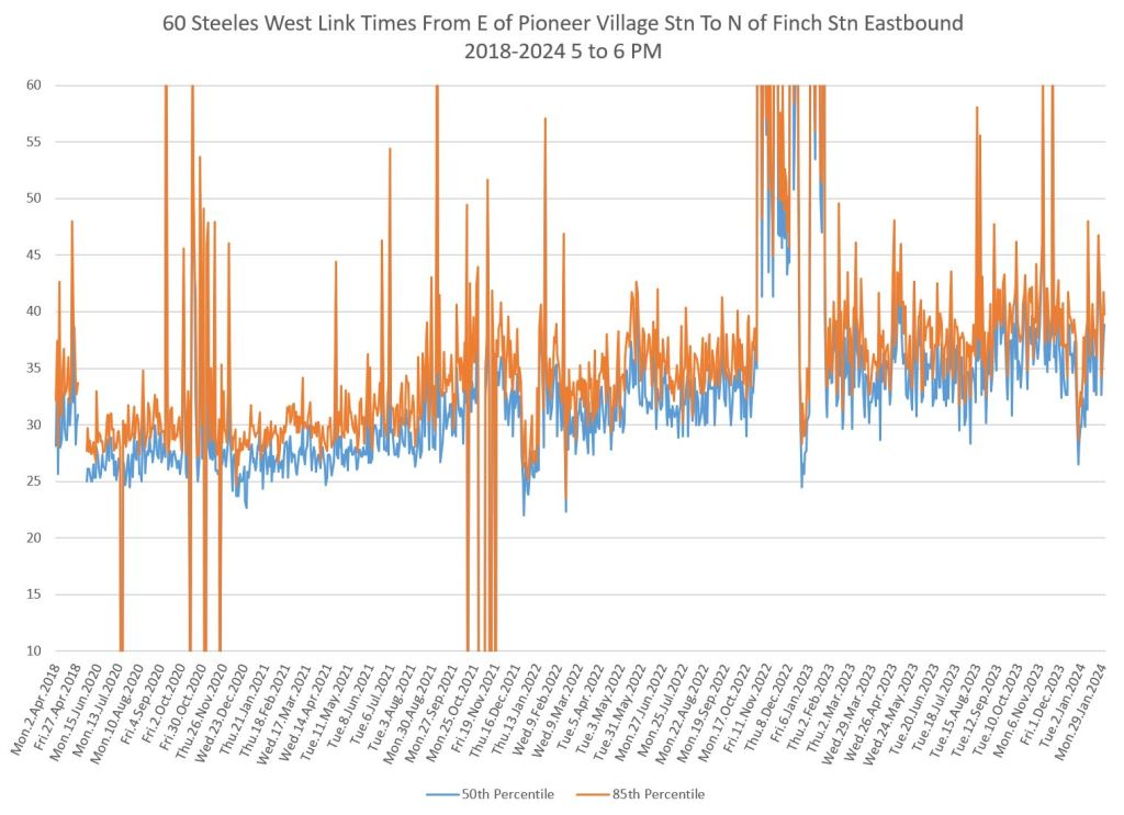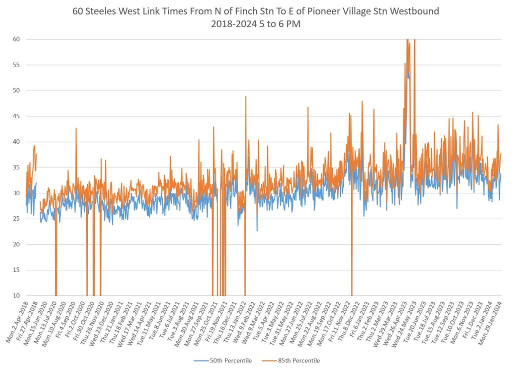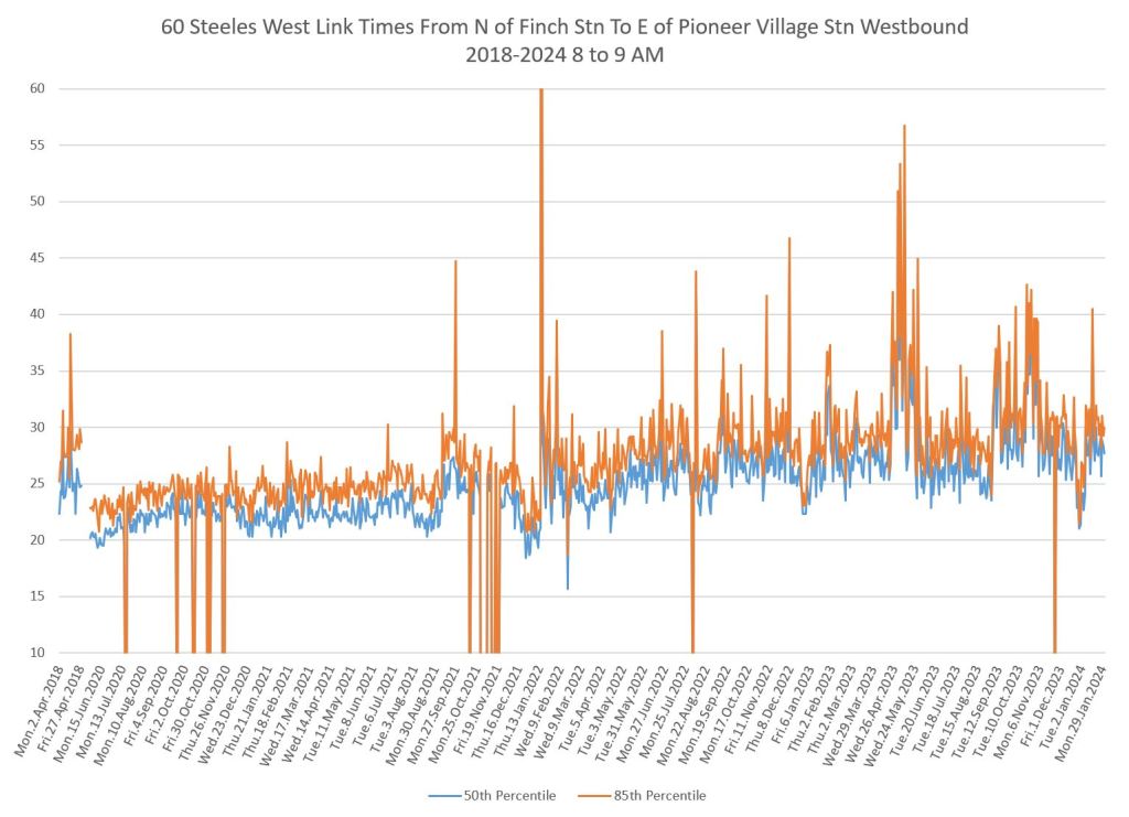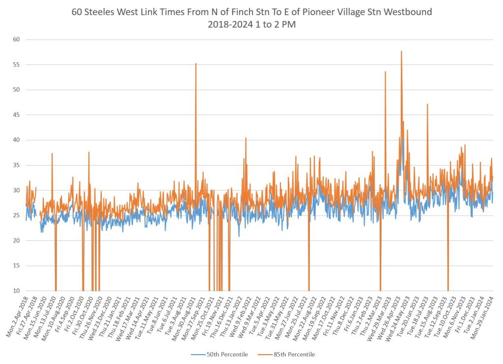 Where the 85th percentiles (orange) spike well above the medians (blue), this shows the day to day variability in travel times that are particularly strong on Steeles West.