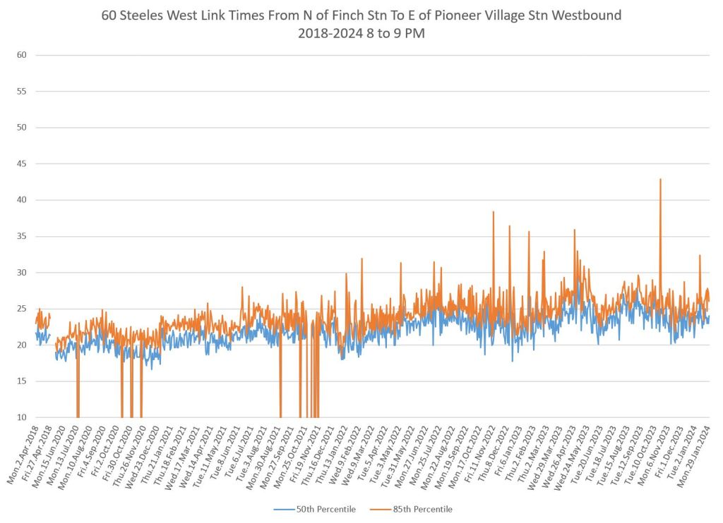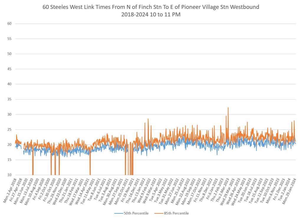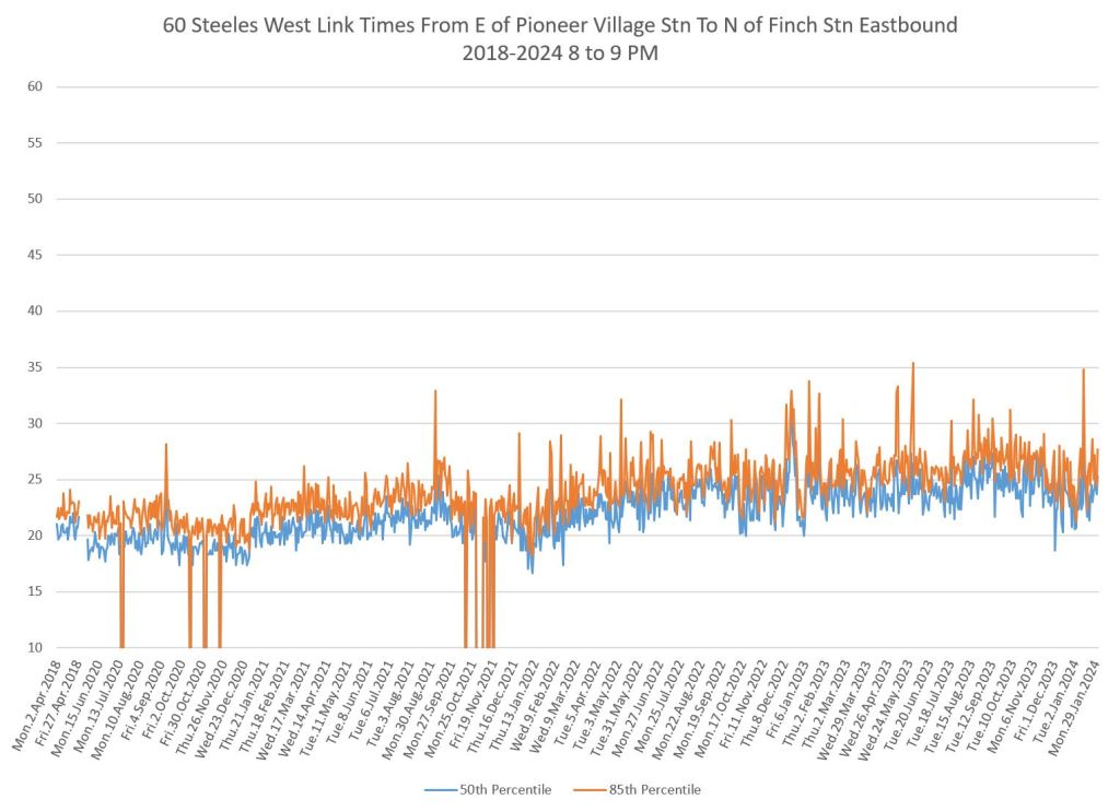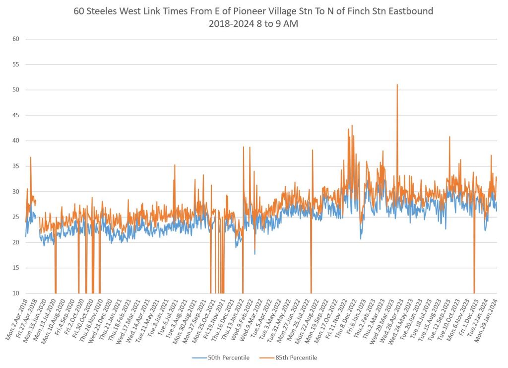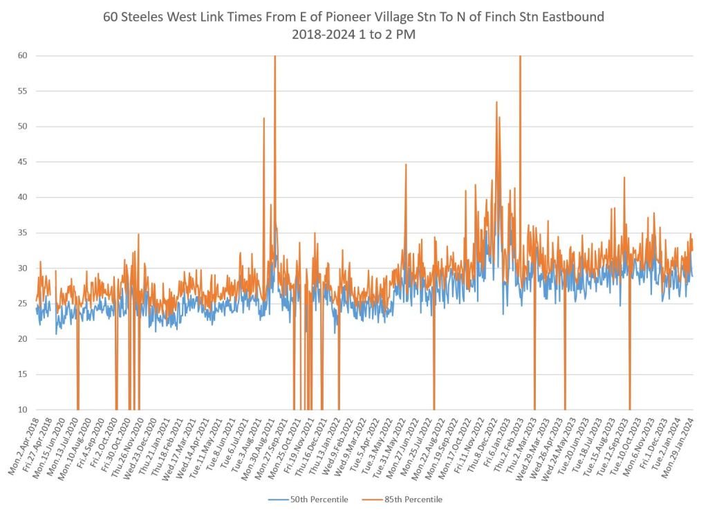 Where the 85th percentiles (orange) spike well above the medians (blue), this shows the day to day variability in travel times that are particularly strong on Steeles West.