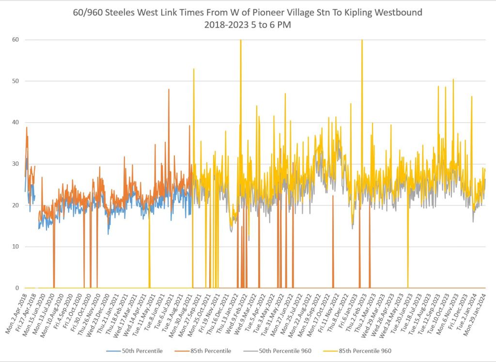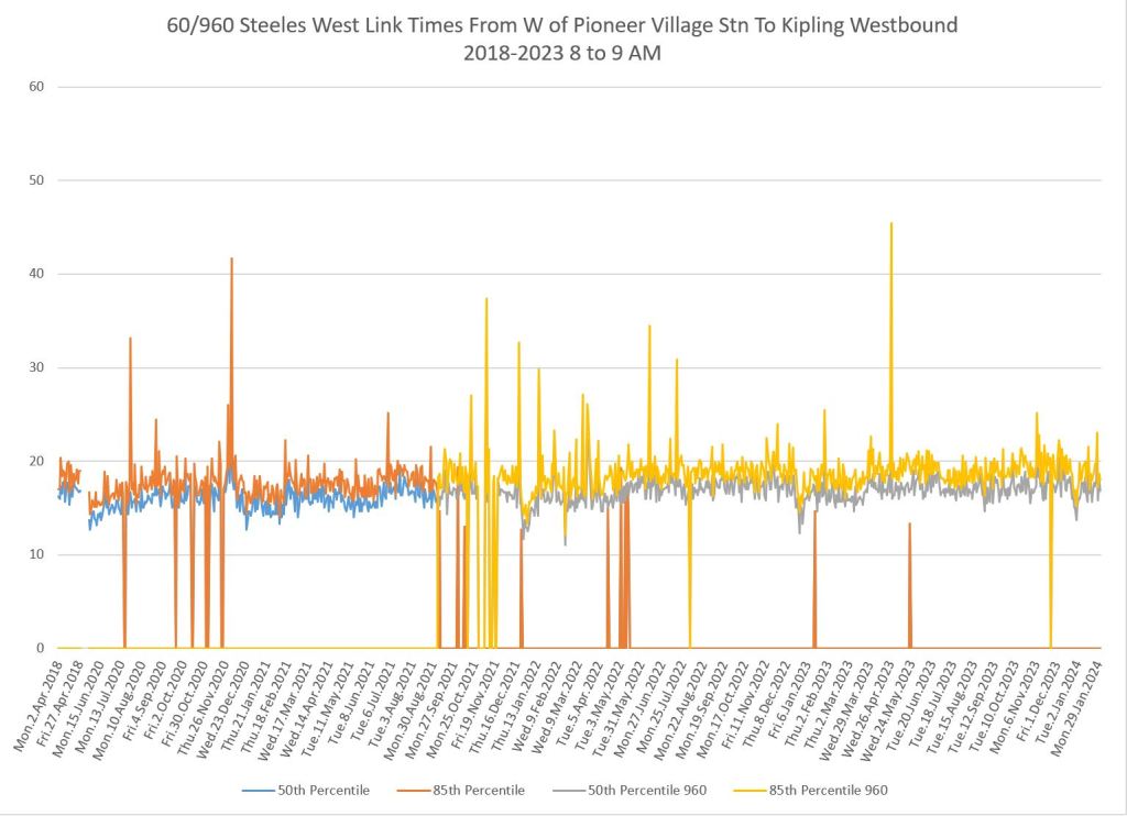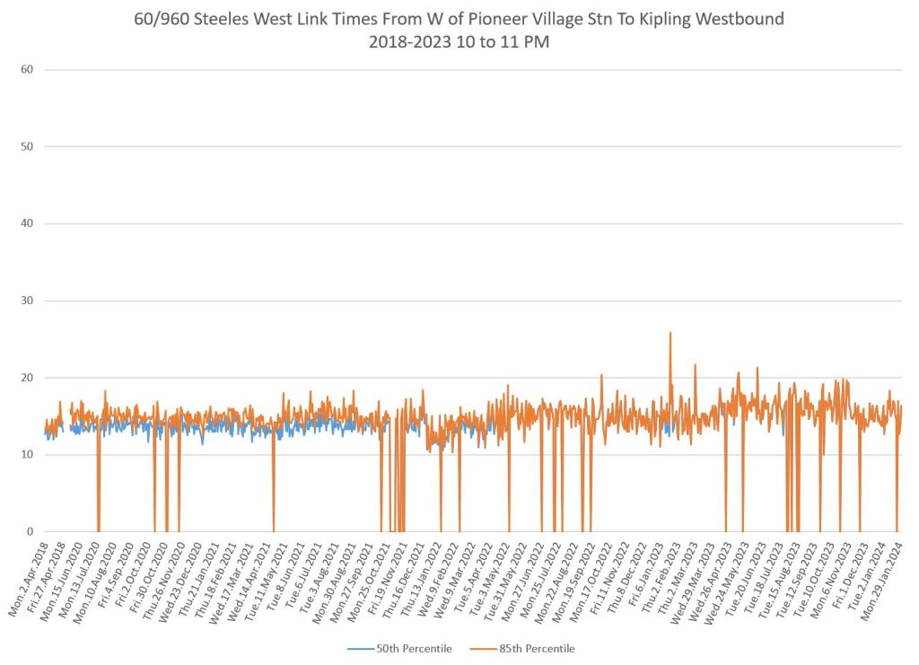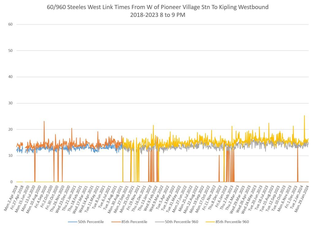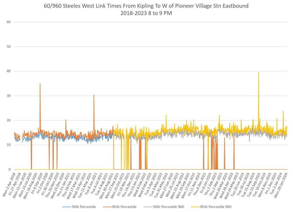 Service west of Pioneer Village Station has been provided at times by the 60 Steeles West Local, and at times by the 960 Steeles West Express. Data for both routes are combined in these charts. At times, buses from both the 60 and 960 services operated west to Kipling, and so the charts overlap. In the late evening period, the 60 Steeles Local runs through over the full route.