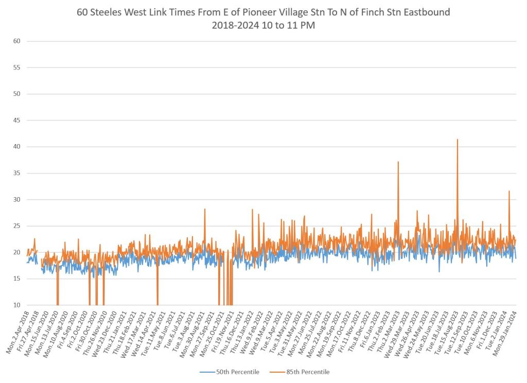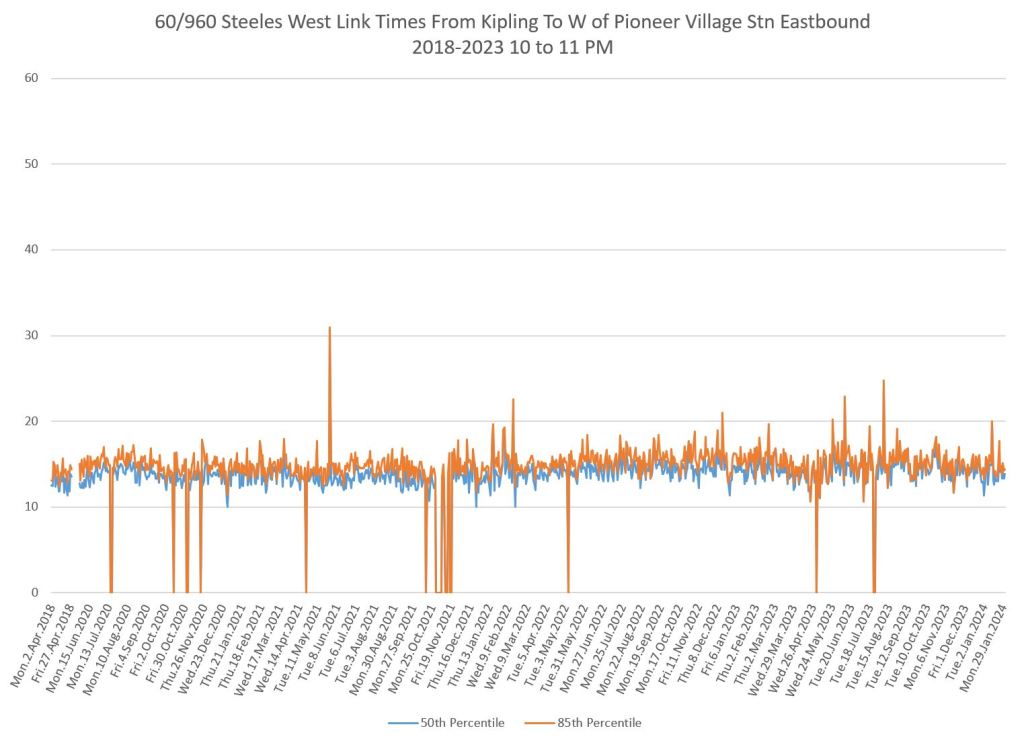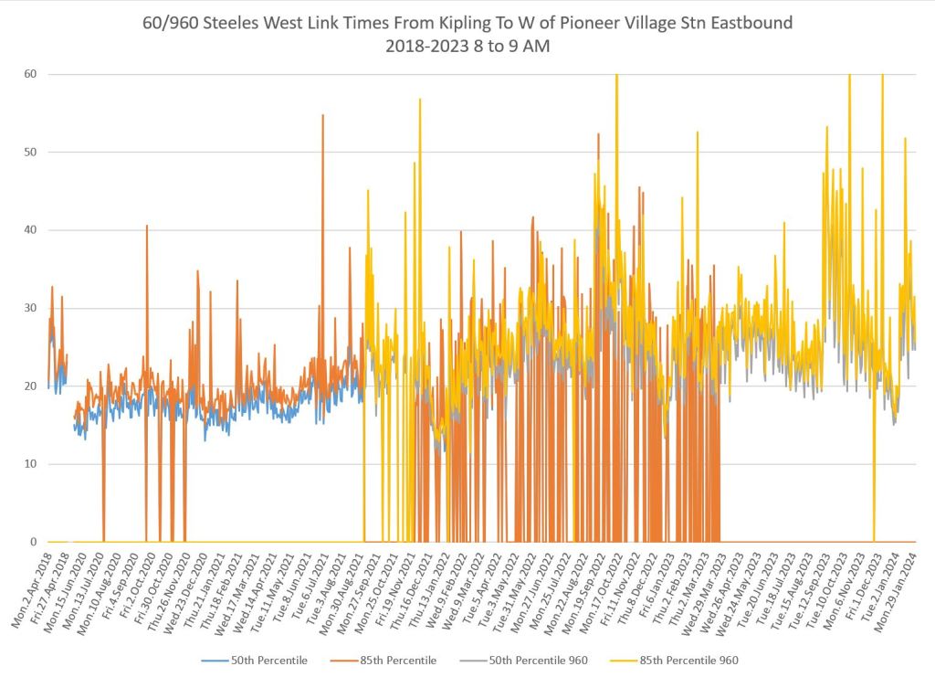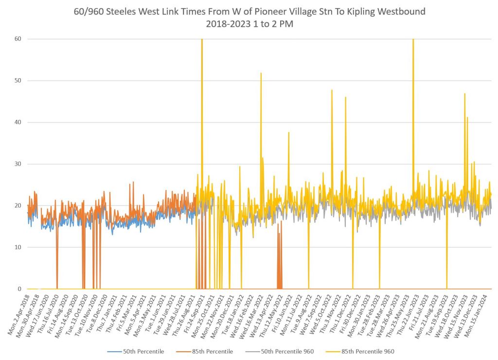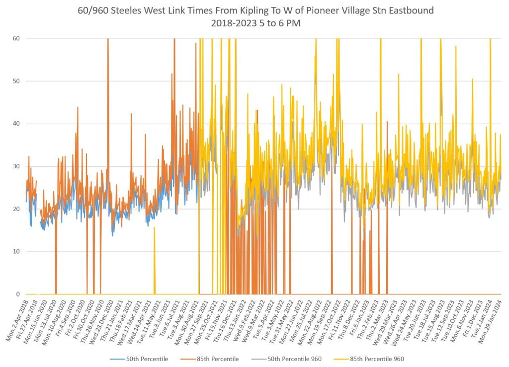 Service west of Pioneer Village Station has been provided at times by the 60 Steeles West Local, and at times by the 960 Steeles West Express. Data for both routes are combined in these charts. At times, buses from both the 60 and 960 services operated west to Kipling, and so the charts overlap. In the late evening period, the 60 Steeles Local runs through over the full route.