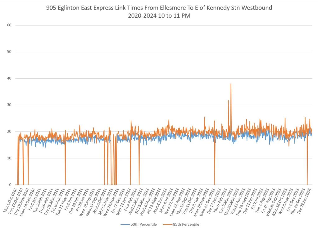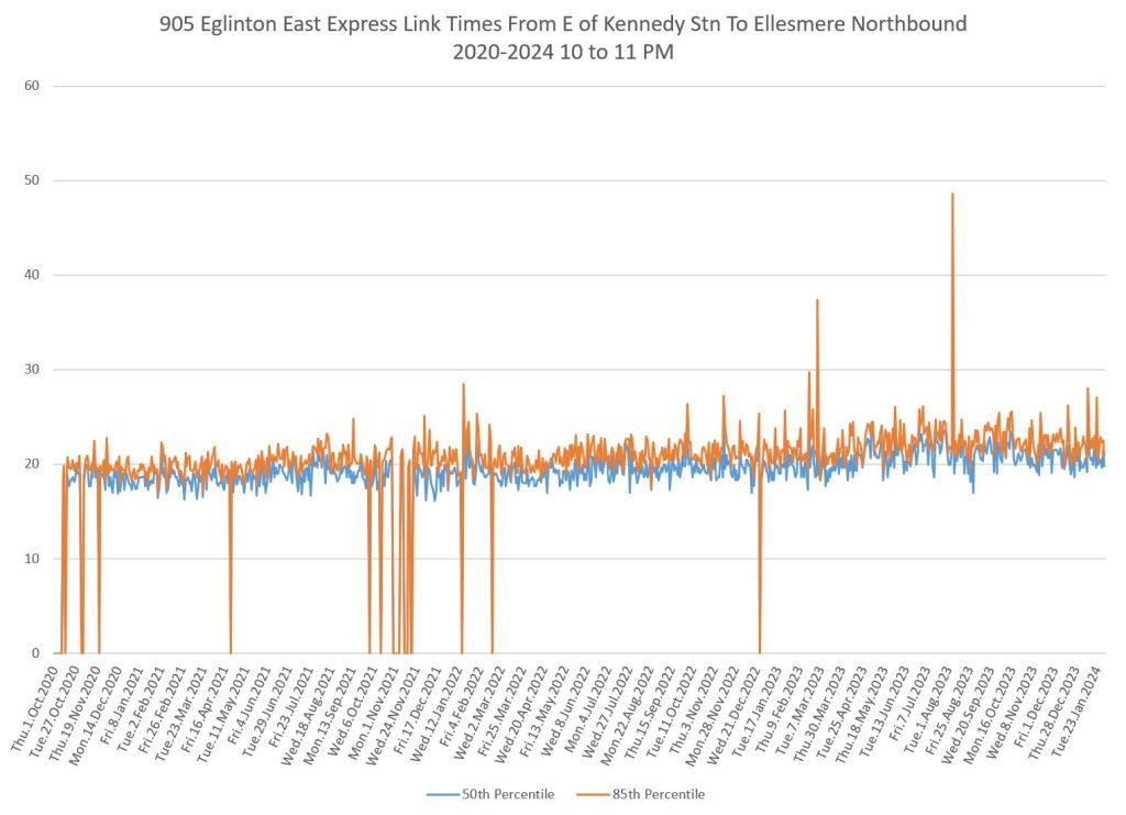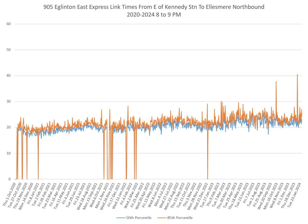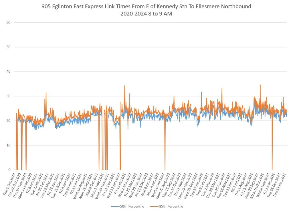 The 905 Eglinton East Express operates over most of its route on red lanes via Eglinton, Kingston Road and Morningside to Ellesmere. I do not have pre-pandemic comparative data for the 198 UTSC Rocket as it was then known.