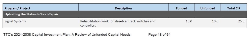 An important difference is that the Operating Budget is funded by fares and City subsidies, while the Capital Budget comes from taxes and borrowing at all levels of government. As an example, the cries for Line 2 subway car funding are familiar in recent years. This diverts attention from much-needed ongoing repairs, a very unglamourous part of transit operations.
