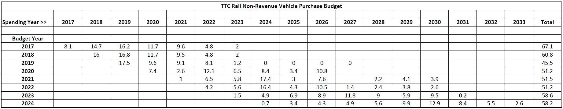 The table below shows how the spending allocated for non-revenue vehicle purchase was constantly shifted ahead year after year with major acquisitions always in the future.