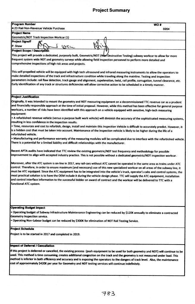 Steve: In light of recent events, the TTC plans to shift to semi-annual inspections. If they had bought their own inspection train, they were planning to move to at least quarterly.
