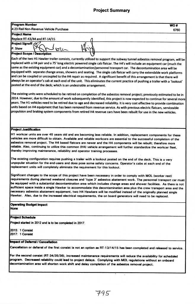 - Two new work trains using retired H4 cars to replace existing 45-year old H1 cars. These trains are used for asbestos remediation work.