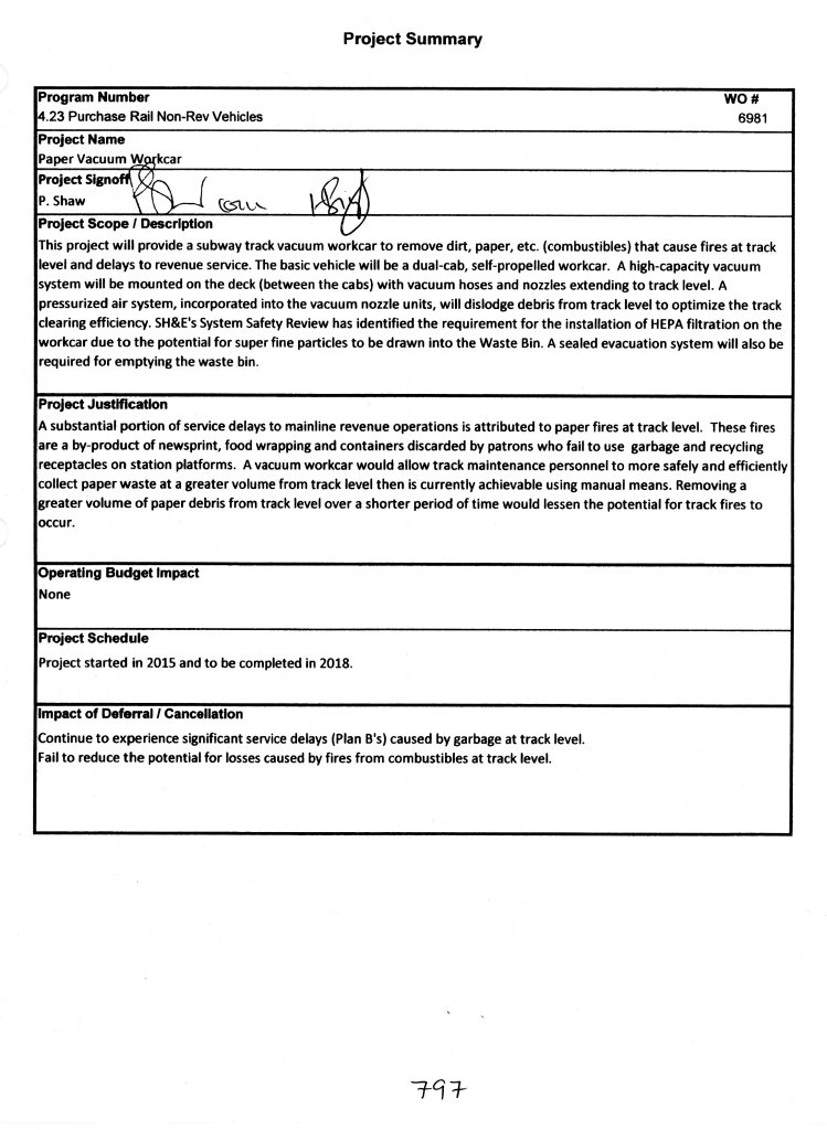 - A subway vacuum car to clean tunnels of debris which can lead to fires.