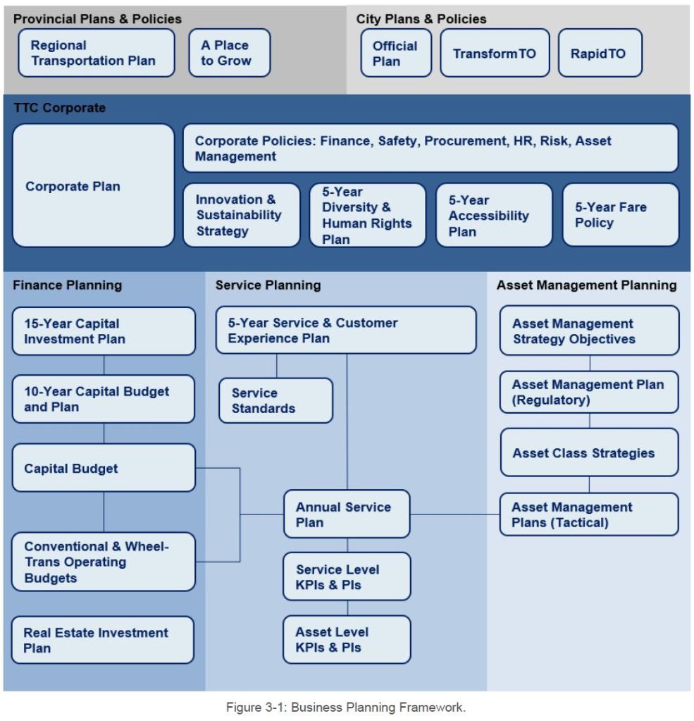 In 2013, the TTC introduced its first 5-Year Corporate Plan with the vision: To be a transit system that makes Toronto proud. The next 5-Year Corporate Plan is due to be published in 2024 and forms part of an integrated planning and performance framework the TTC utilizes. This framework demonstrates how the goals, objectives and intended outcomes of the TTC can be achieved through the alignment of key business planning activities. In addition, the 5-Year Service Plan & 10-Year Outlook (2020-2024) identifies service-related improvements to public transit service in the city of Toronto. An updated version (2024-2028) is expected to be published in 2024.