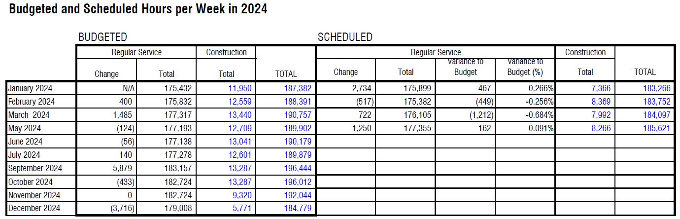 Updated May 10, 2024 at 5:15 pm: Construction project list added. Tables of service hours and fleet allocations added.
