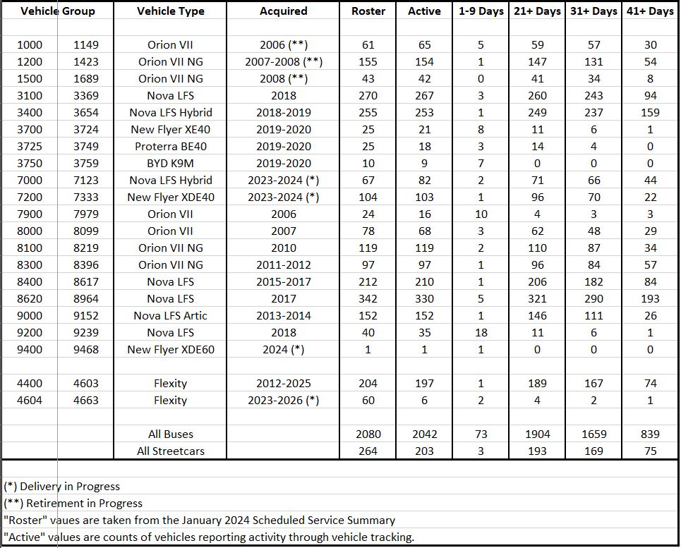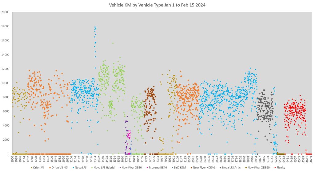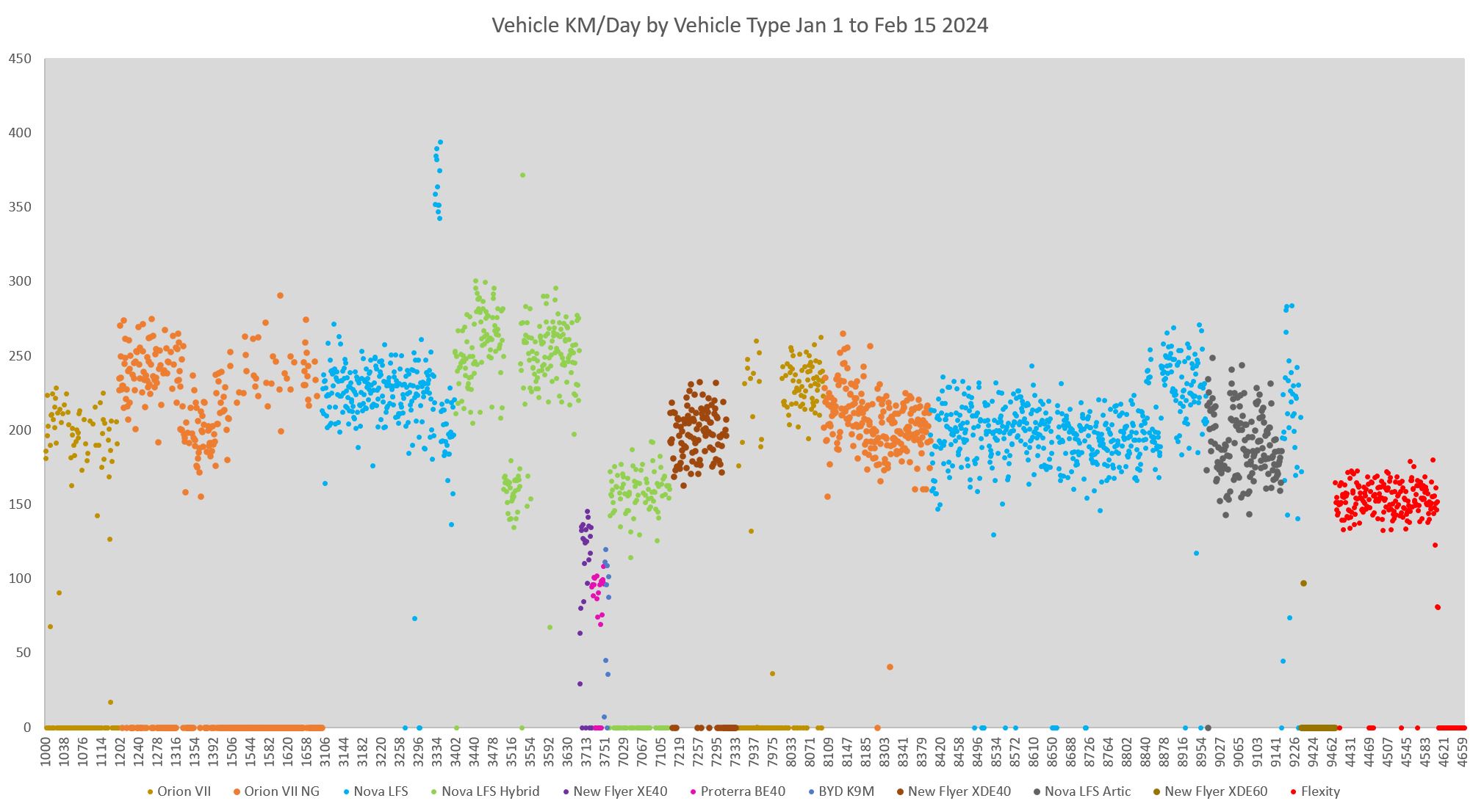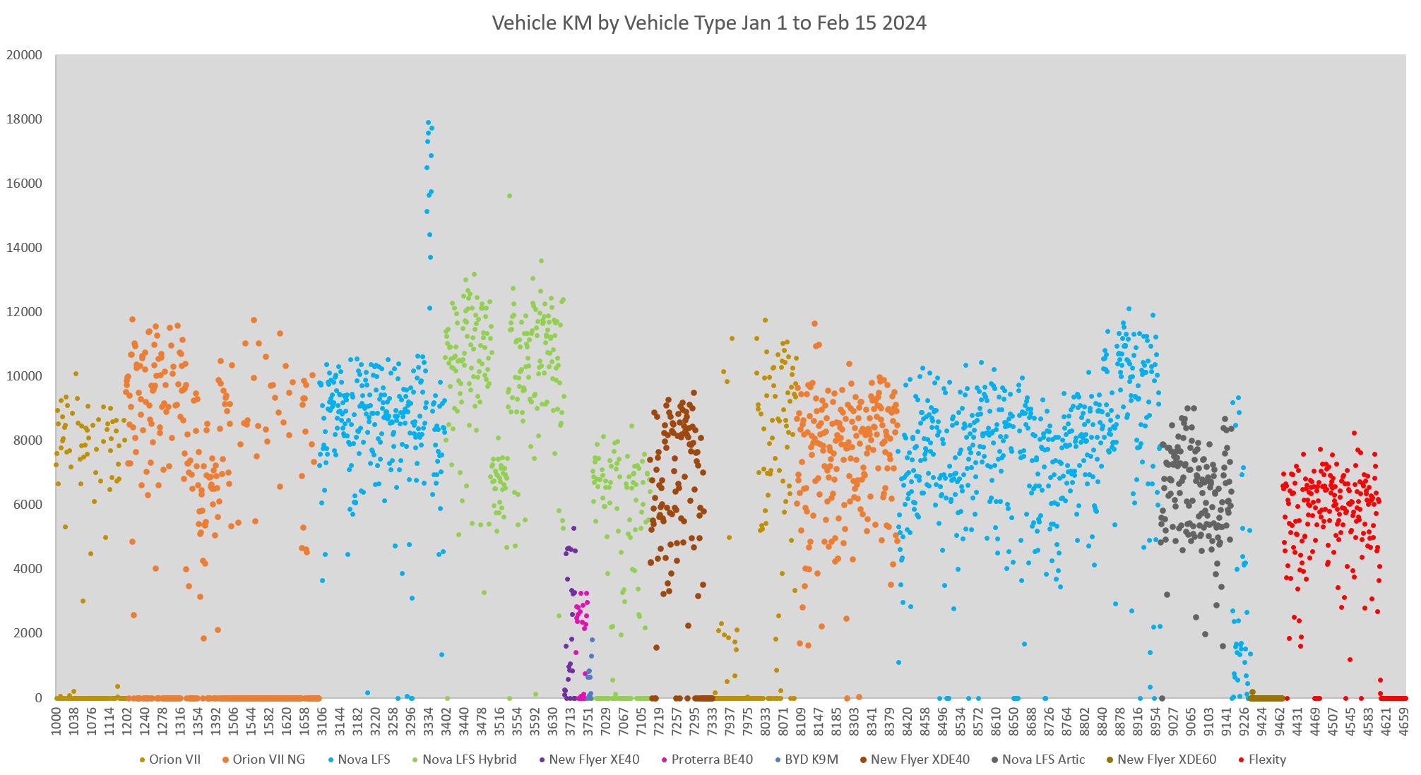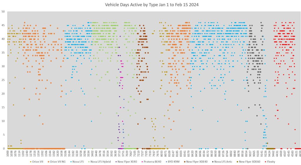 A summary of the fleet use from January 1 to February 15, 2024, is shown below. A quick guide to the chart using the first set of buses, 1000-1149:
